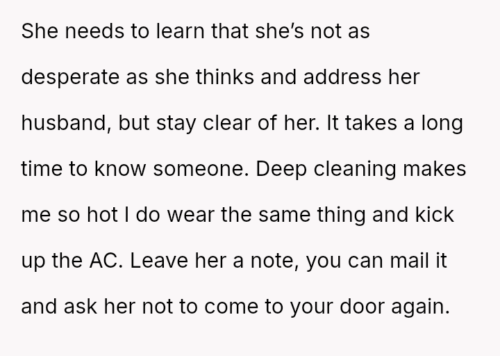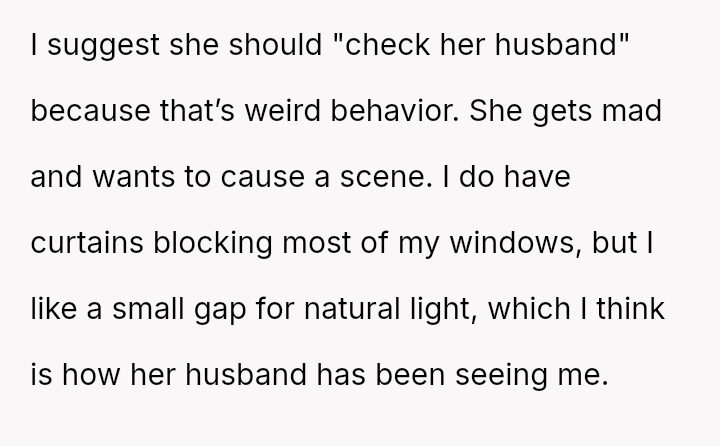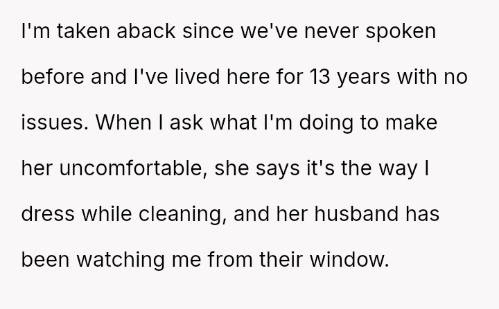 When pressed for details, the neighbor specified that the discomfort stemmed from the OP's clothing—a sports bra and shorts—worn while cleaning, claiming her husband had been watching the OP through the window.