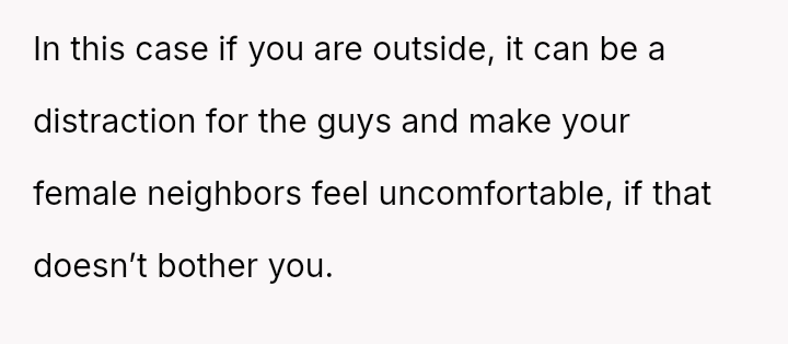 The conflict rests on where one person's freedom to dress meets another person's perception of comfort, complicated by the reported inappropriate behavior of the neighbor's husband.