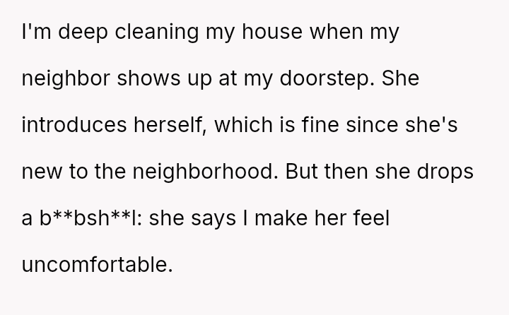 The original poster (OP) was engaged in routine deep cleaning inside their home when a newly introduced neighbor arrived at their door with a serious complaint.