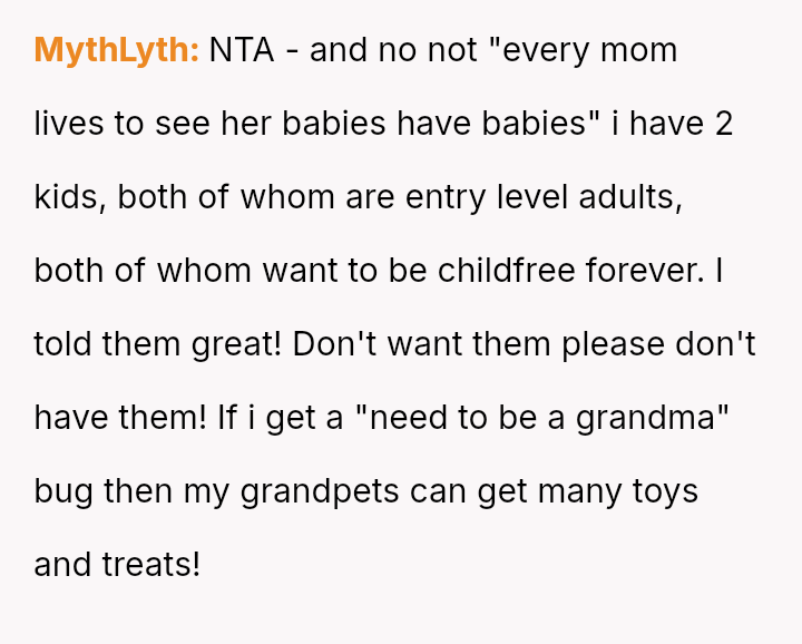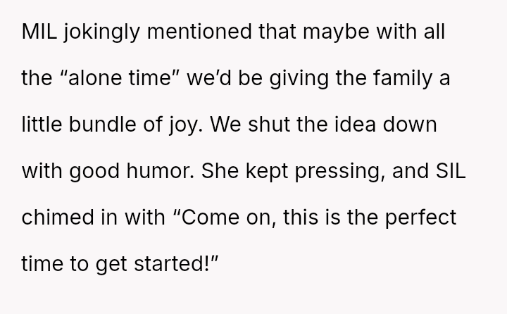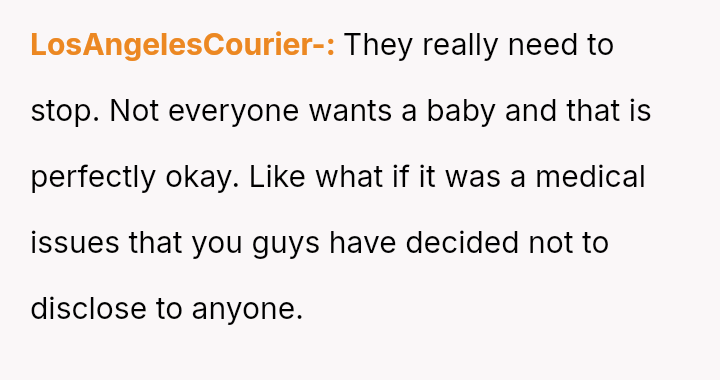 The central conflict lies between the OP's firm boundary regarding their life choices and the family's deeply held, yet intrusive, expectation that the couple should eventually reproduce.