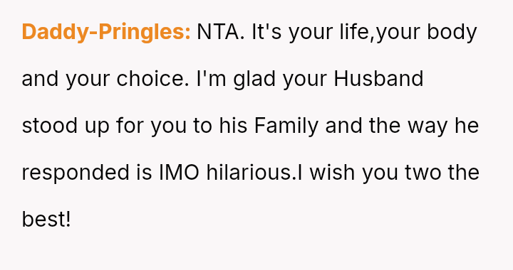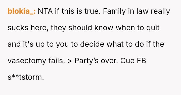 The original poster (OP) and their husband faced relentless pressure from family members regarding their decision not to have children, culminating in a heated confrontation after the husband revealed he had a vasectomy.