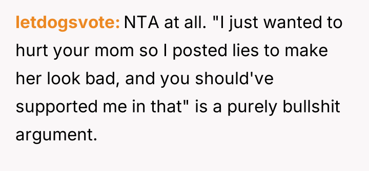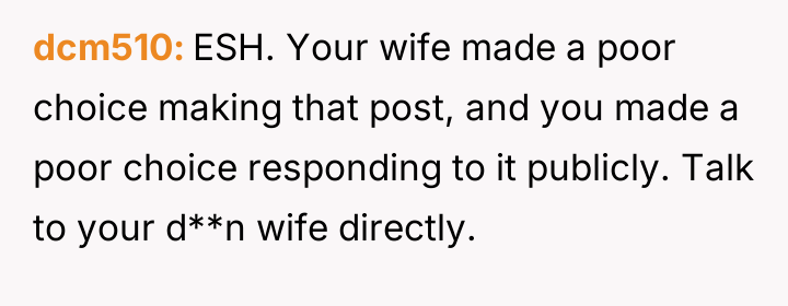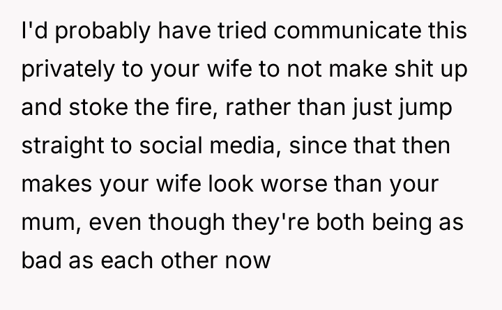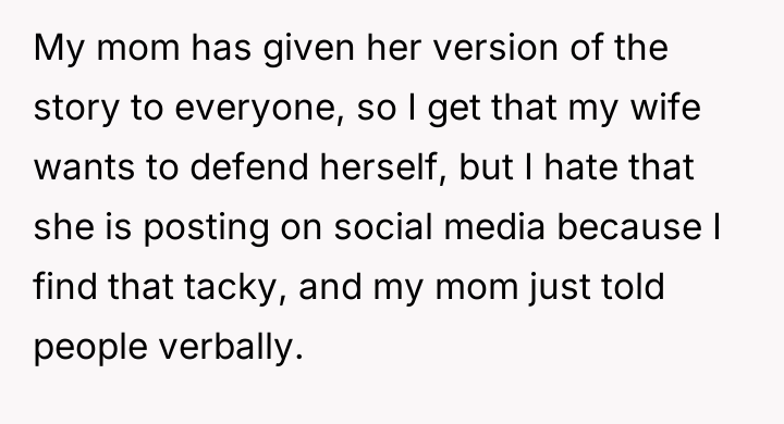 However, the OP is now caught in a secondary conflict with their wife regarding her public posts about the situation, especially after the OP intervened in the online dispute.