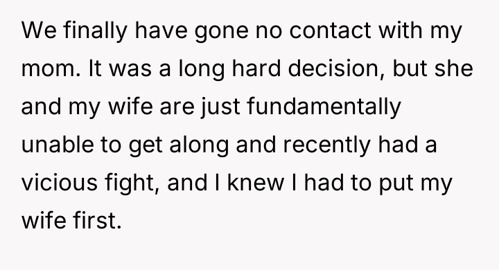The original poster (OP) reached a breaking point in the conflict between their mother and spouse, leading to the difficult decision of initiating no contact with the mother to protect the marriage.