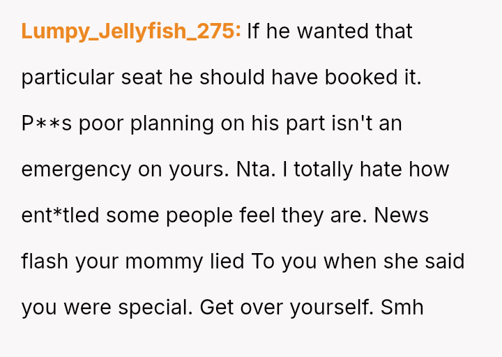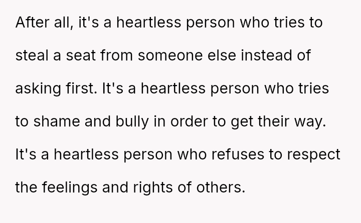 The central debate is whether maintaining a firm boundary regarding a prepaid item justifies the negative emotional response it provoked, or if basic courtesy required the poster to yield his preference for the comfort of another stranger. Was the poster justified in holding firm to his reservation?