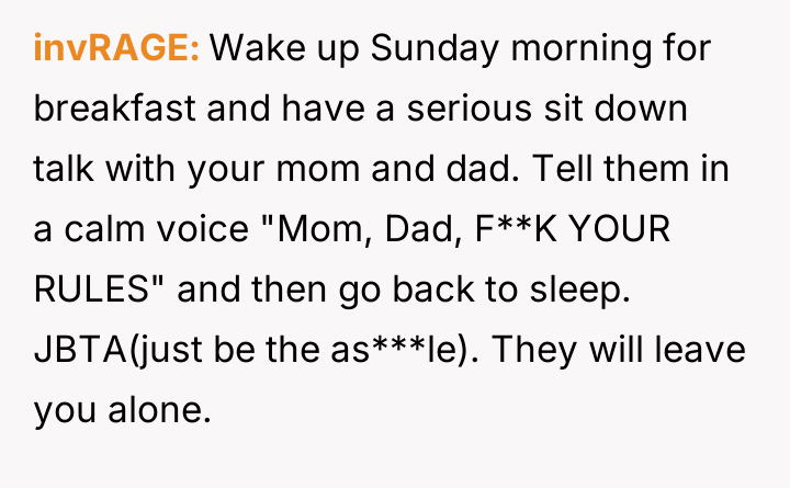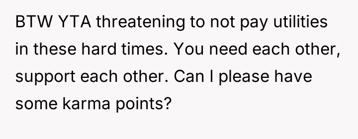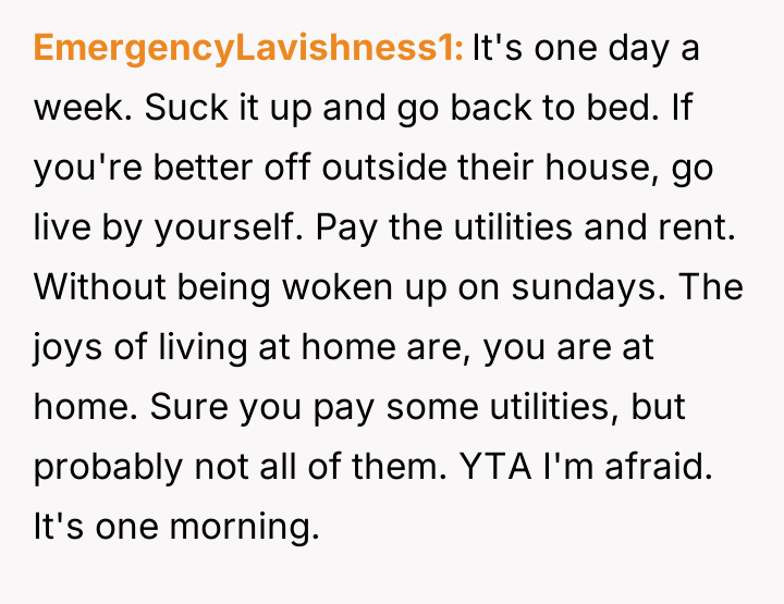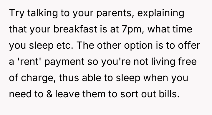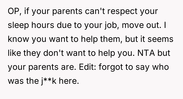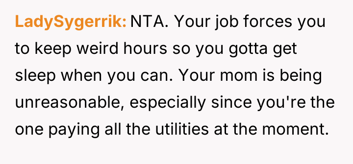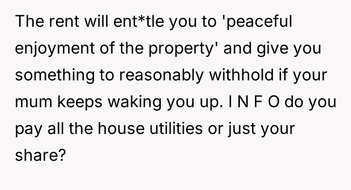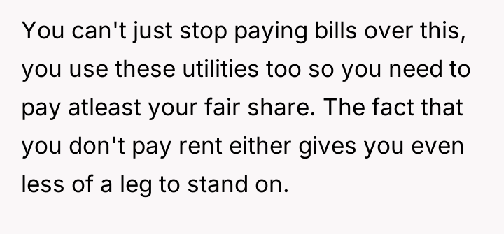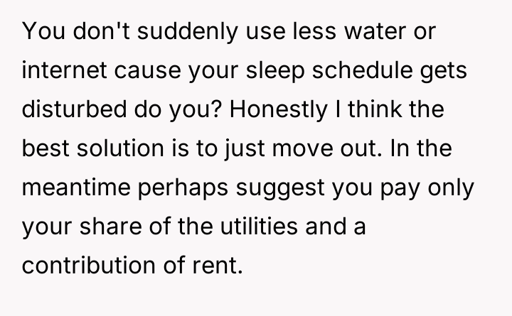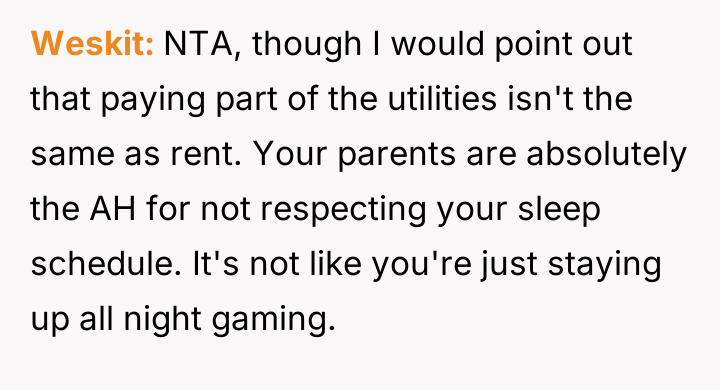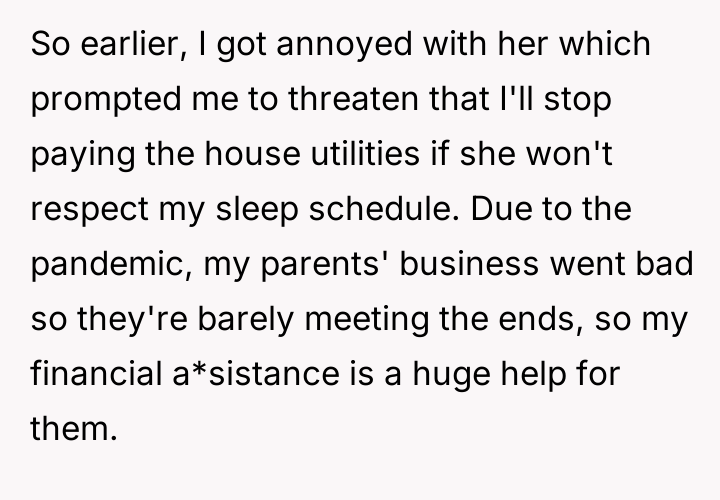 The conflict escalated severely when the OP used their financial contribution—paying utilities—as leverage to enforce their boundary regarding sleep, causing significant anger from both parents.