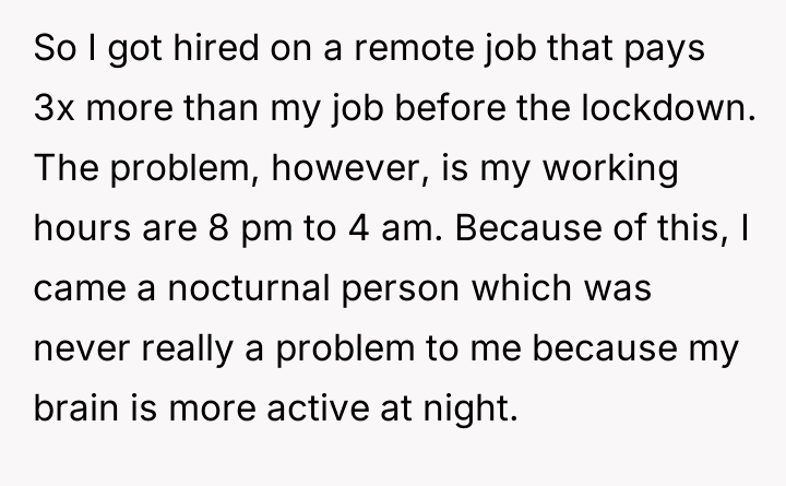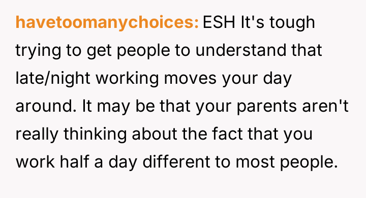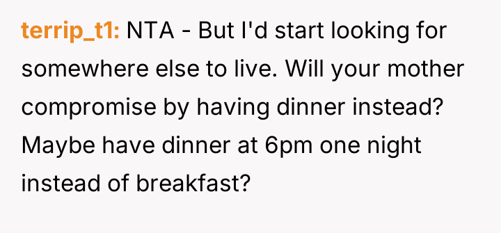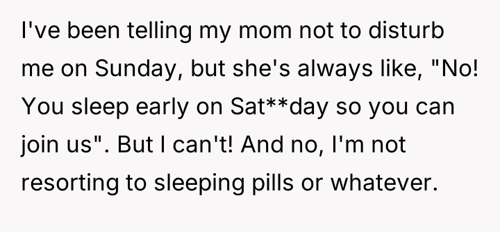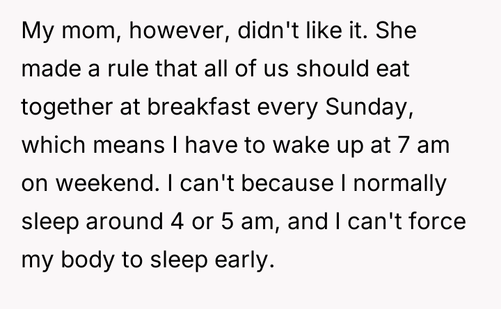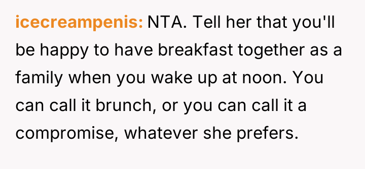 The Original Poster (OP) is caught between maintaining a necessary, high-paying, but nocturnal work schedule and fulfilling a family expectation set by their mother regarding Sunday breakfast.
