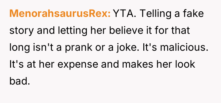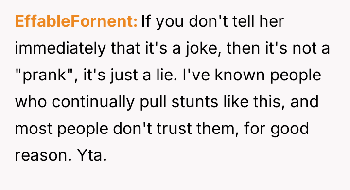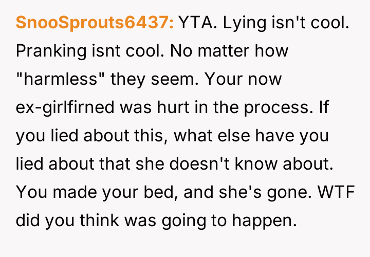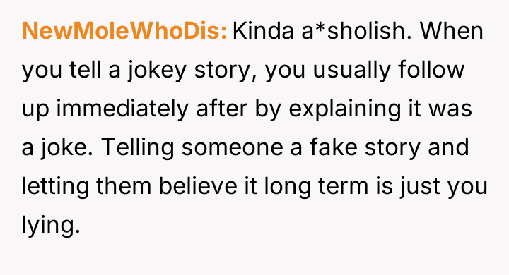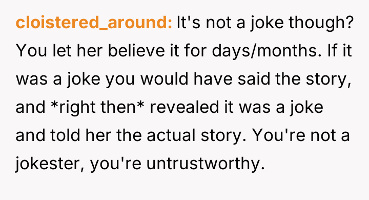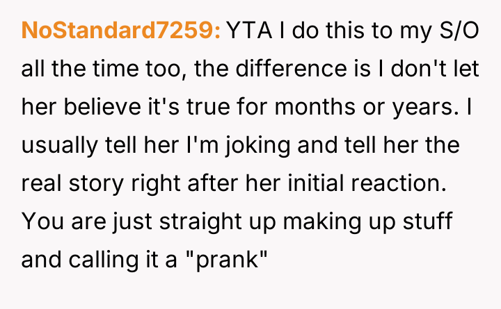 The original poster (OP) is facing severe relationship consequences because a long-held, elaborate prank story was revealed to his family, causing widespread upset rather than amusement as he expected.