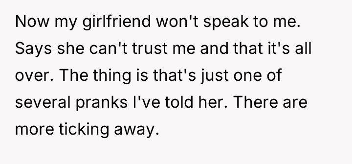 His girlfriend has withdrawn communication, citing a loss of trust, while the OP struggles to understand why his perceived humor is not being shared by those involved.