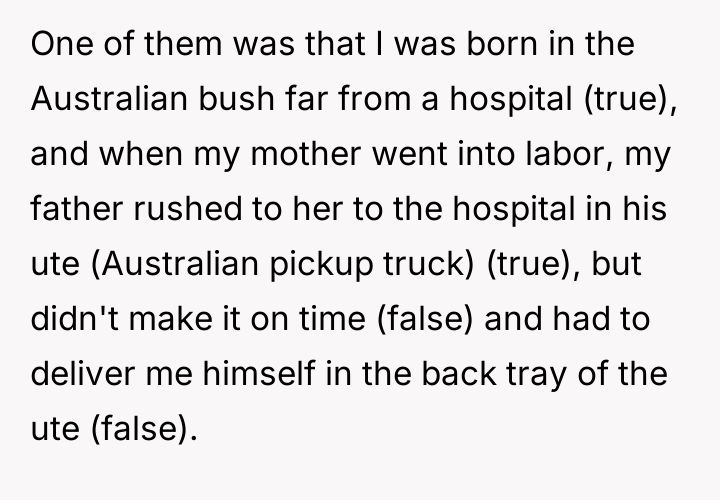 Among them was the story of his dramatic birth in the Australian bush—a vivid image of a rugged father delivering his son in the back of a ute, a tale embroidered with just enough truth to feel real, yet crafted entirely from imagination.