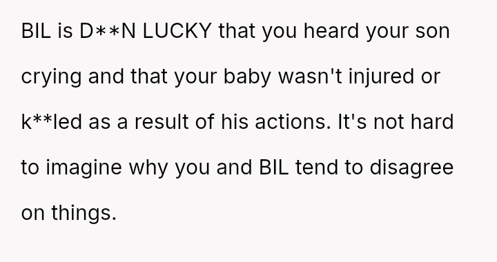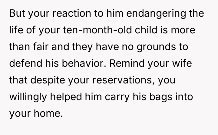 The husband (OP) acted decisively to protect his infant son and maintain the agreed-upon boundaries in his small living space, leading to a severe conflict with his visiting brother-in-law (BIL) and subsequent friction with his wife and in-laws.