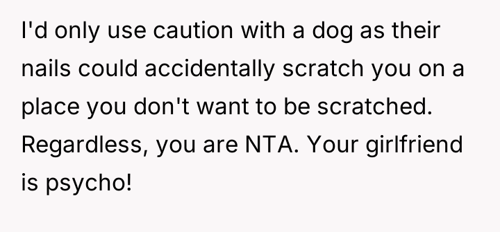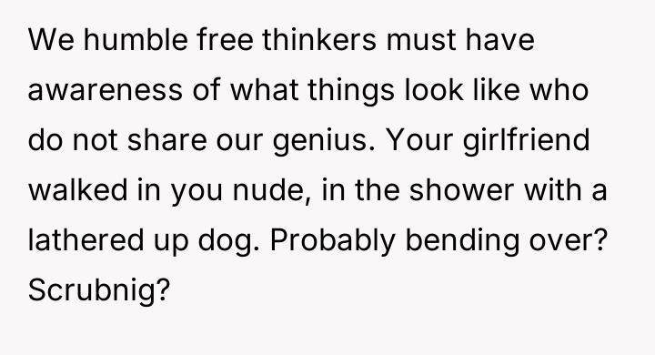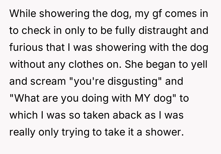 The central conflict lies between the OP's practical goal (a clean dog without a mess) and the girlfriend's intense emotional reaction to seeing the OP nude with her dog, which escalated into anger and accusations.