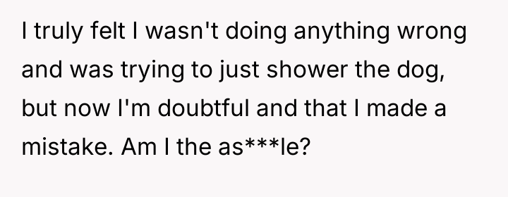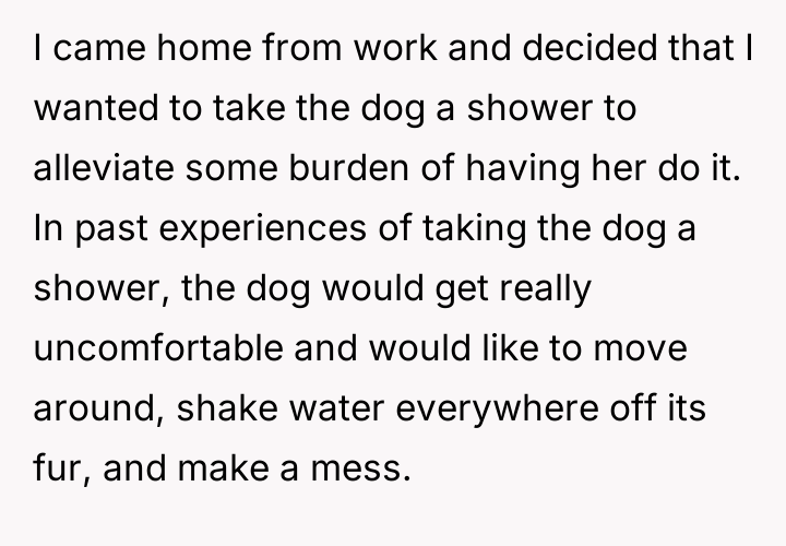 The original poster (OP) acted with the intention of performing a helpful chore, showering the girlfriend's dog thoroughly, but this action was executed in a manner that deeply violated the girlfriend's personal boundaries and comfort level.