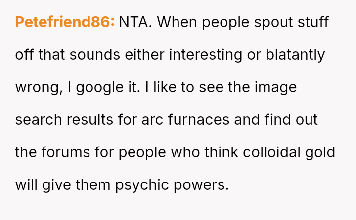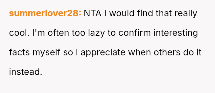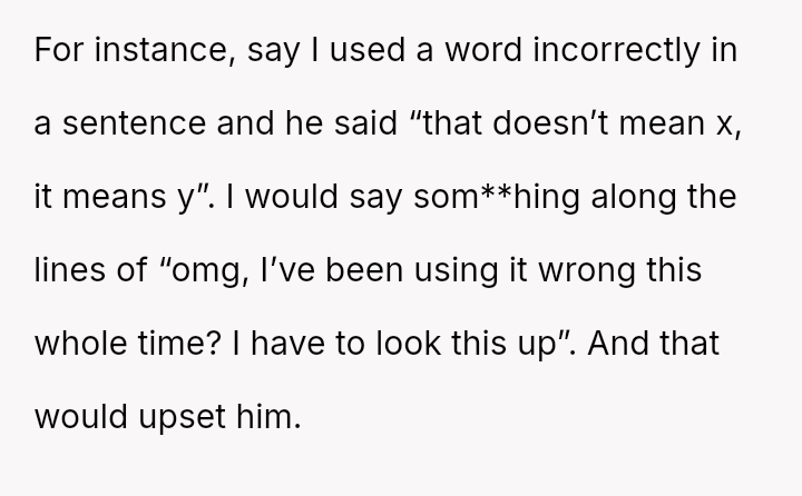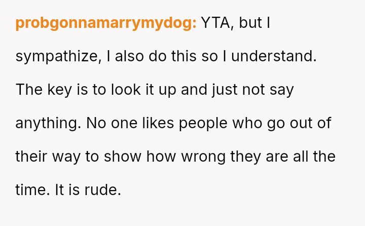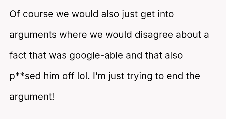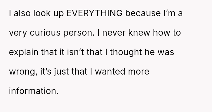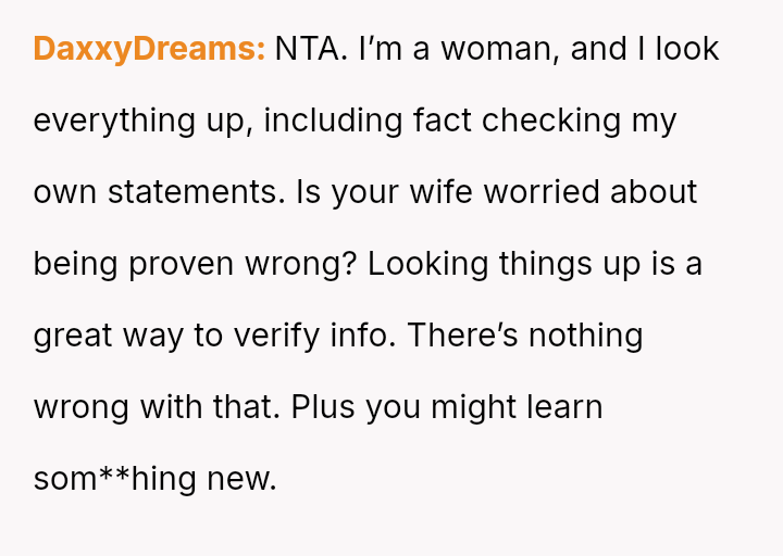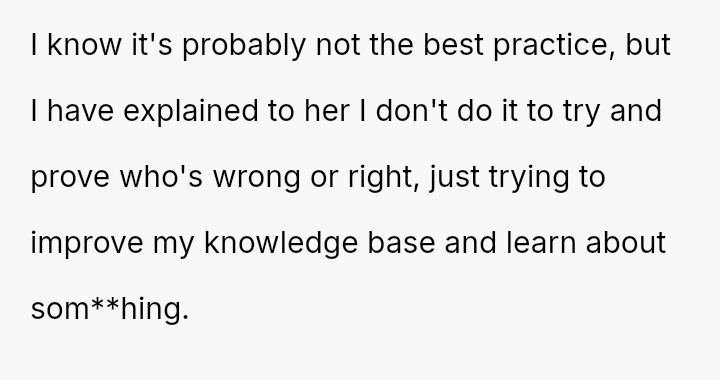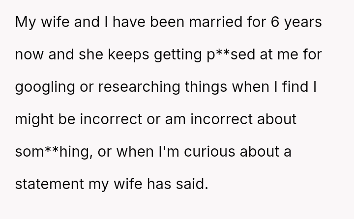 The original poster (OP) is facing conflict because his need to verify information or deepen his knowledge through searching clashes directly with his wife's perception that this action implies a lack of trust in her statements.