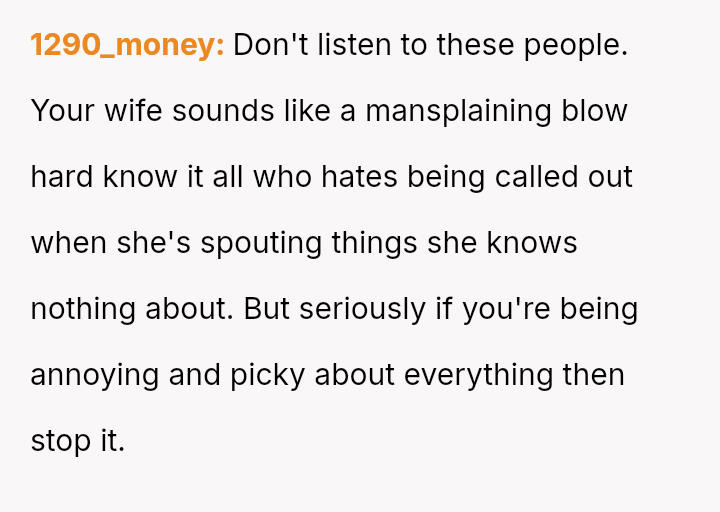 The central tension lies between the OP's desire for objective learning and the wife's emotional need for affirmation and belief within the relationship.