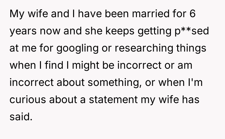 The original poster (OP) is facing conflict because his need to verify information or deepen his knowledge through searching clashes directly with his wife's perception that this action implies a lack of trust in her statements.