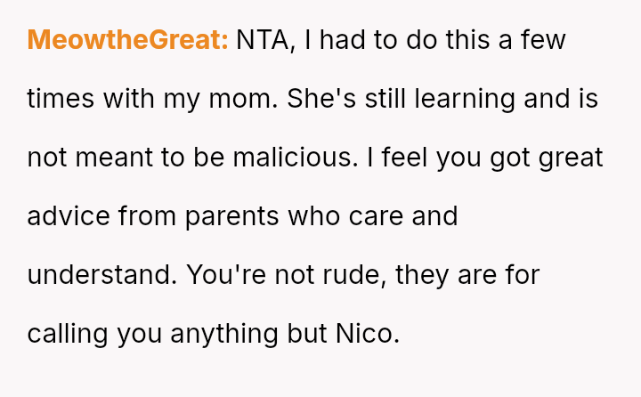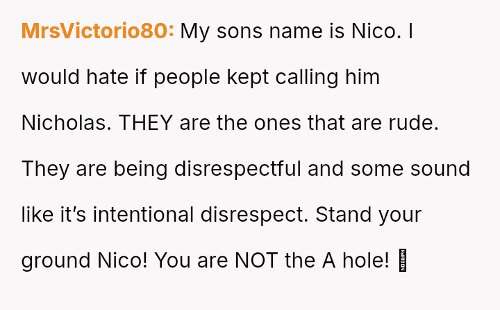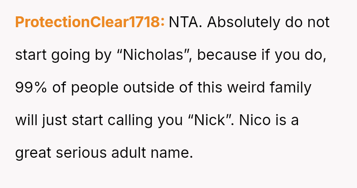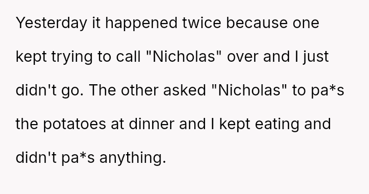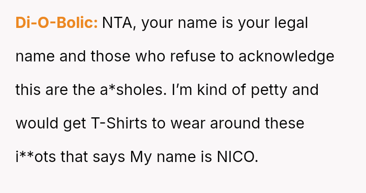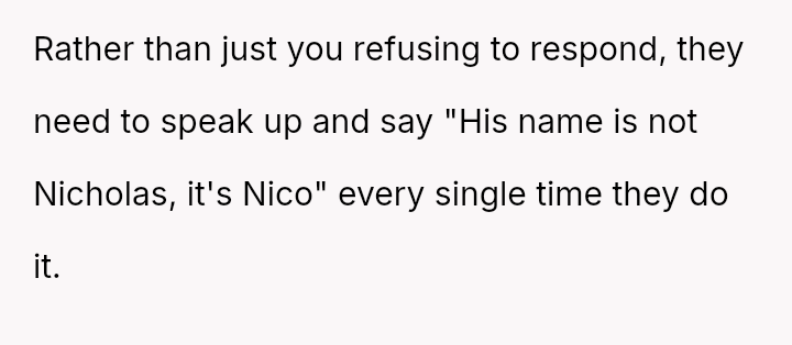 Is Nico justified in a*serting his ident*ty by ignoring those who deliberately use the wrong name, even if it causes friction with extended family, or should he prioritize social harmony by accepting the repeated misnaming given the importance of maintaining a s**ble placement?