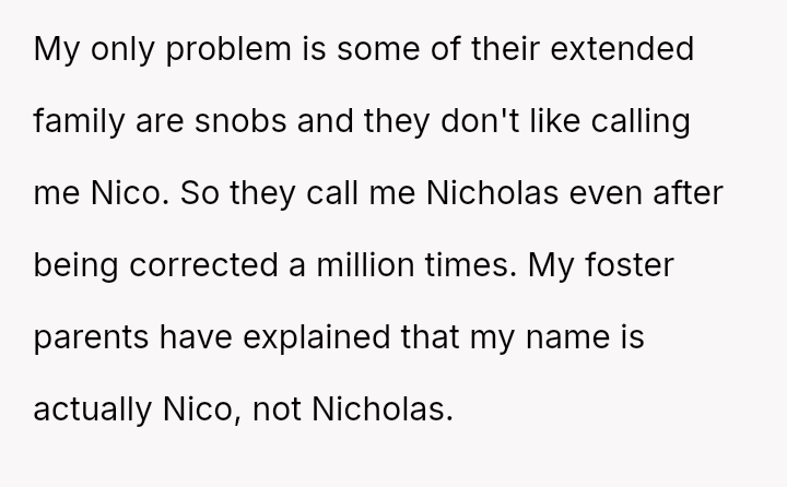 Nico is facing a conflict where his deeply held personal ident*ty, centered on his name, clashes with the persistent, unso***ited suggestions from his foster family's extended relatives.