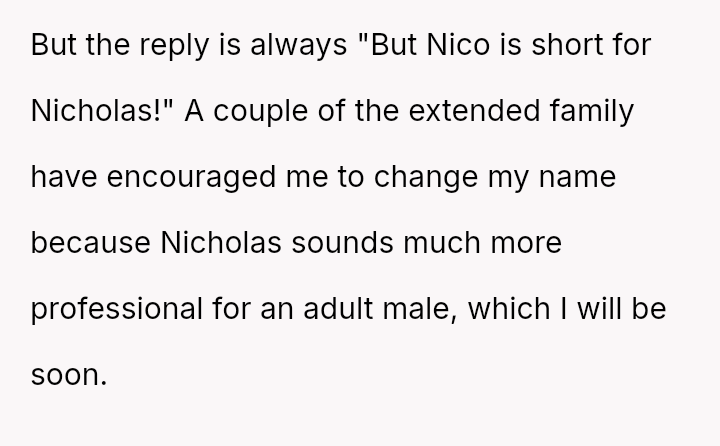 While his foster parents support his right to be called Nico, the pressure from relatives who insist on using 'Nicholas' for perceived professionalism creates significant emotional strain and forces him into a difficult choice between a*serting his ident*ty and maintaining peace within his highly valued foster home.