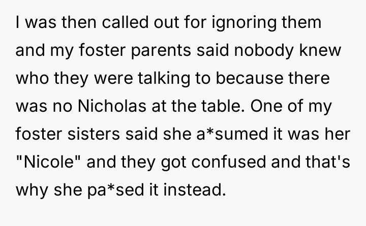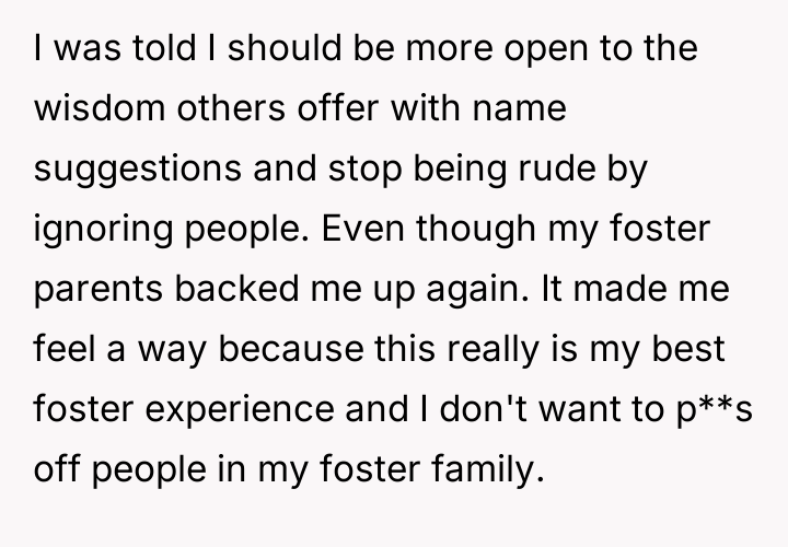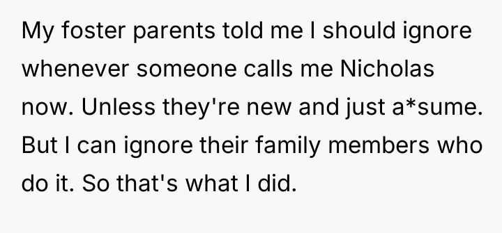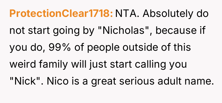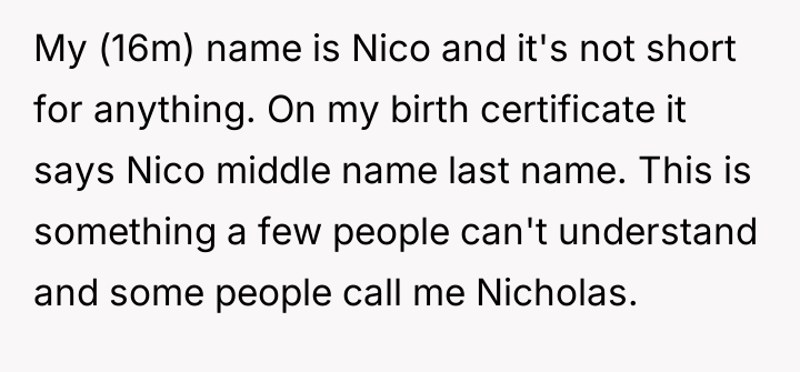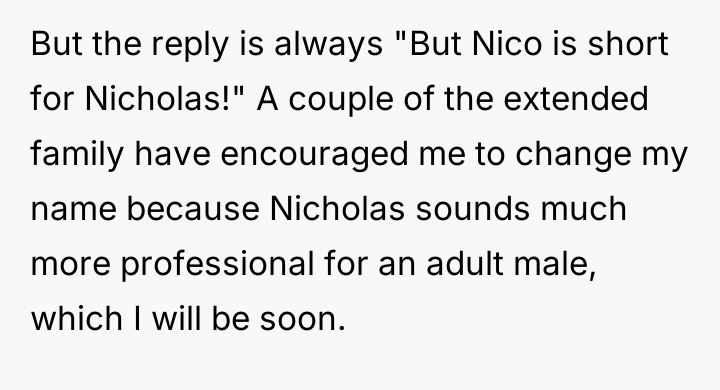 Nico is facing a conflict where his deeply held personal identity, centered on his name, clashes with the persistent, unsolicited suggestions from his foster family's extended relatives.