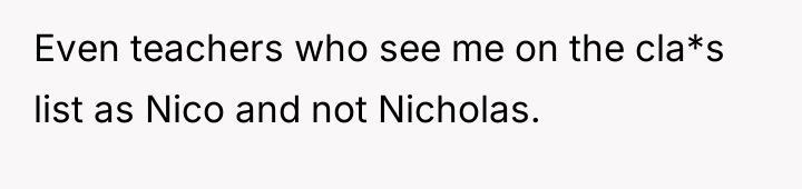While his foster parents support his right to be called Nico, the pressure from relatives who insist on using 'Nicholas' for perceived professionalism creates significant emotional strain and forces him into a difficult choice between asserting his identity and maintaining peace within his highly valued foster home.