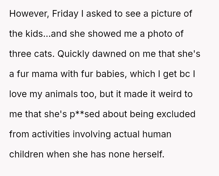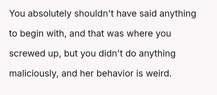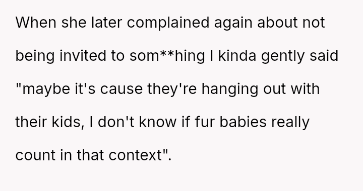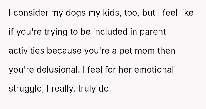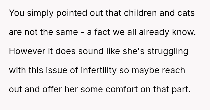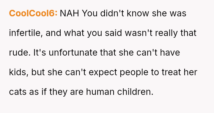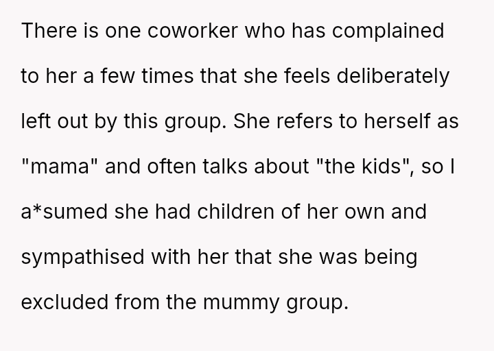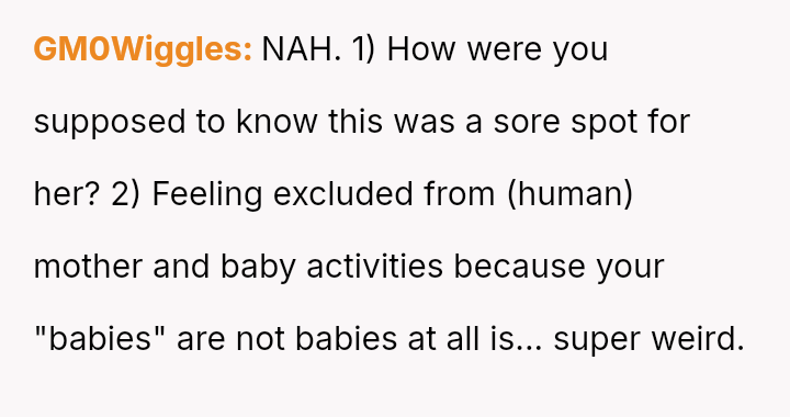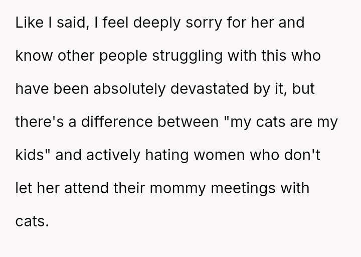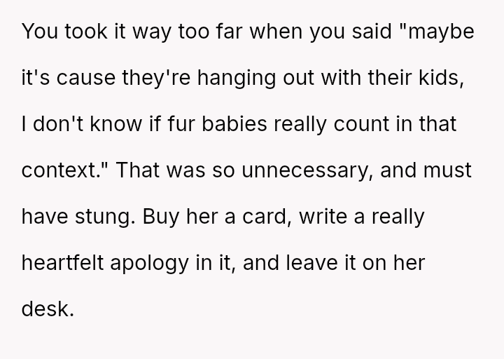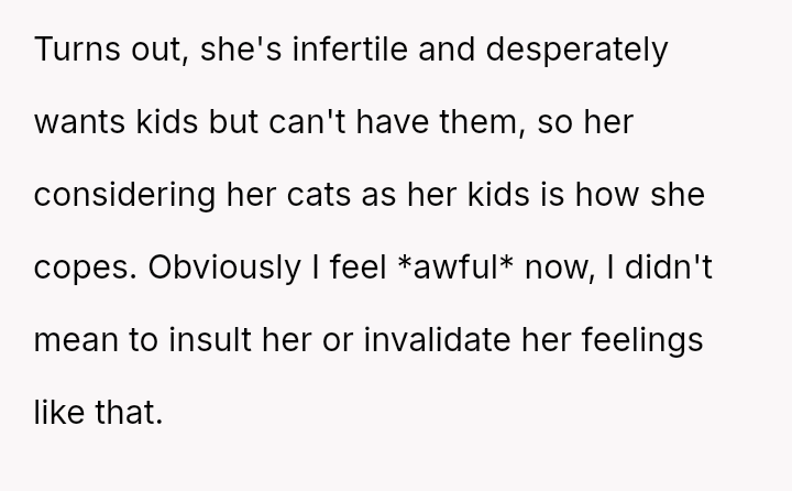 The original poster (OP) unintentionally caused significant emotional distress to a coworker by dismissing her feelings of exclusion, only realizing later that the coworker’s ident*ty as a "mama" referred to her cats, which masked a deeper pain related to infertility.