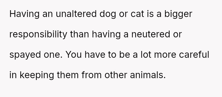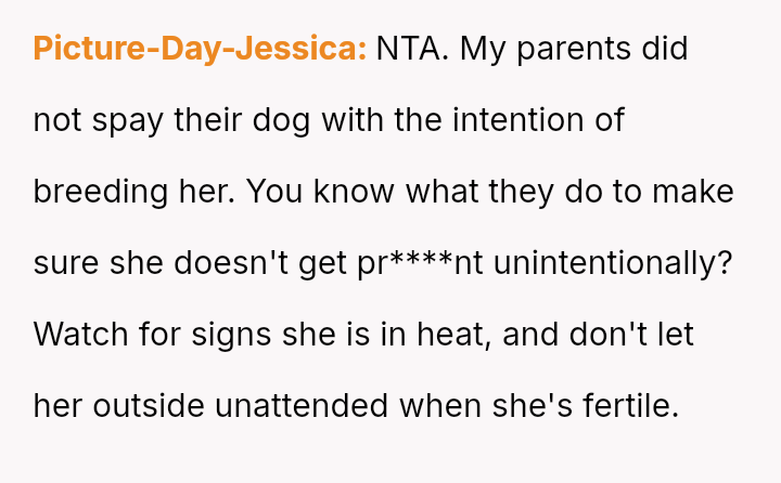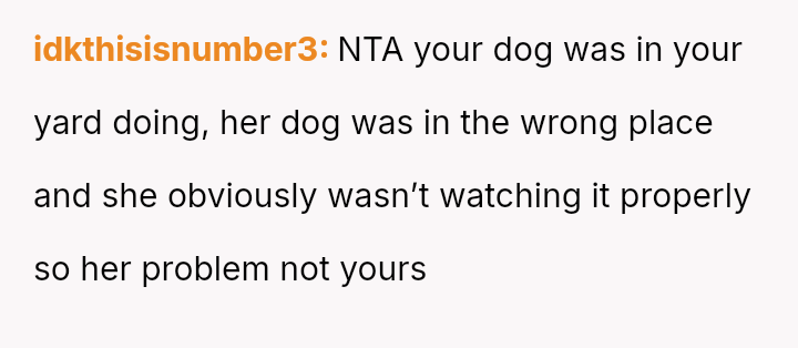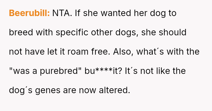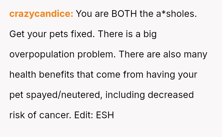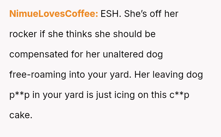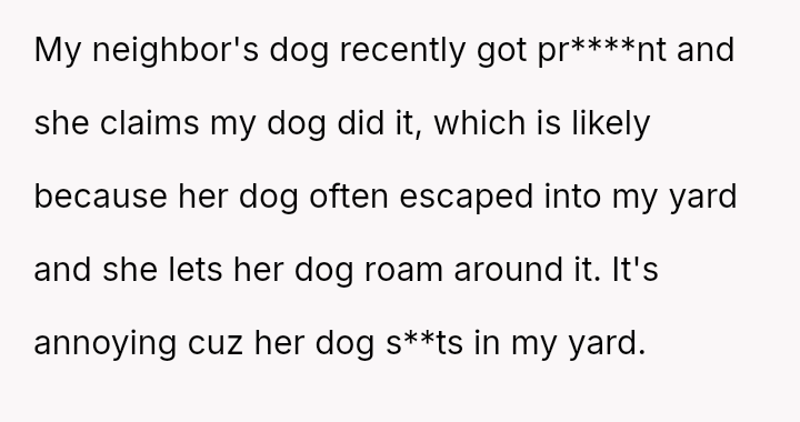 The central conflict revolves around the neighbor's expectation that the OP should a*sume full financial responsibility for an accidental litter resulting from her dog entering the OP's property.