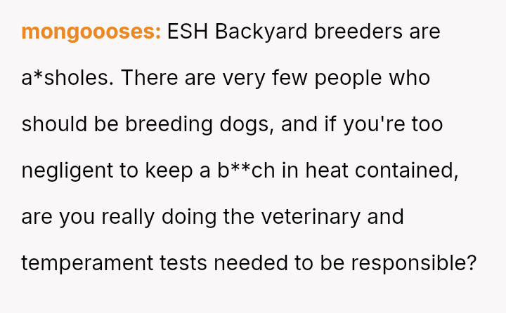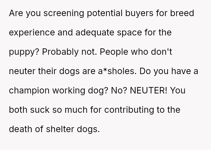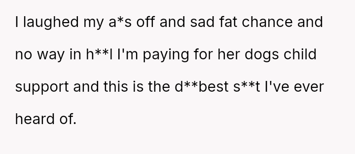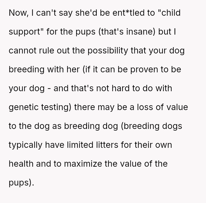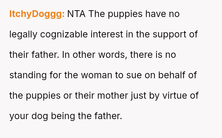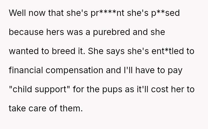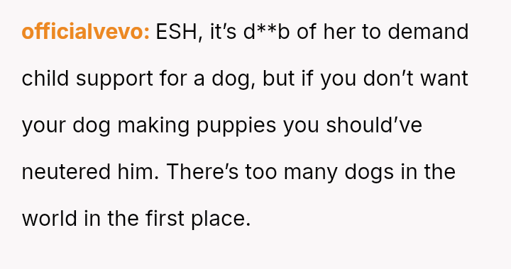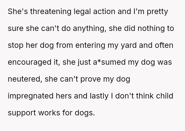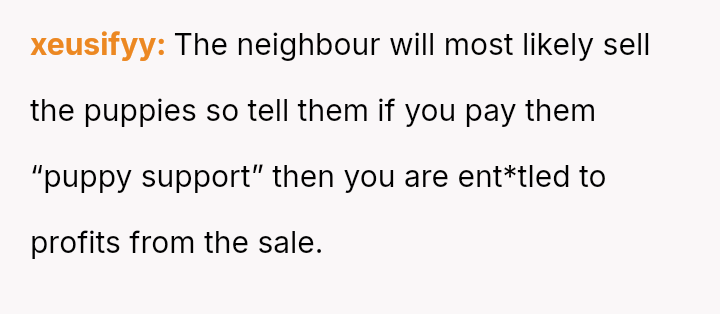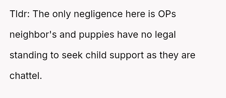 The original poster (OP) is firmly rejecting the neighbor's demands for financial compensation and "child support" regarding the unplanned puppies, viewing the claim as absurd given the neighbor's failure to contain her own dog.