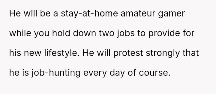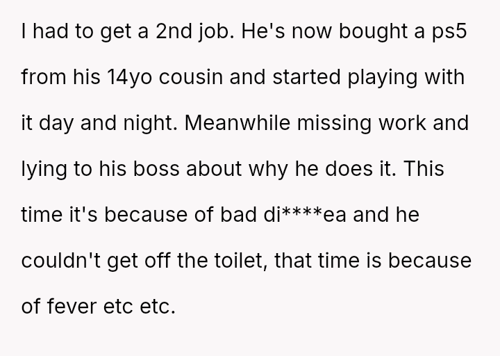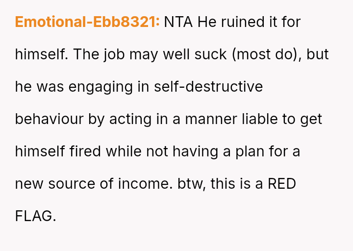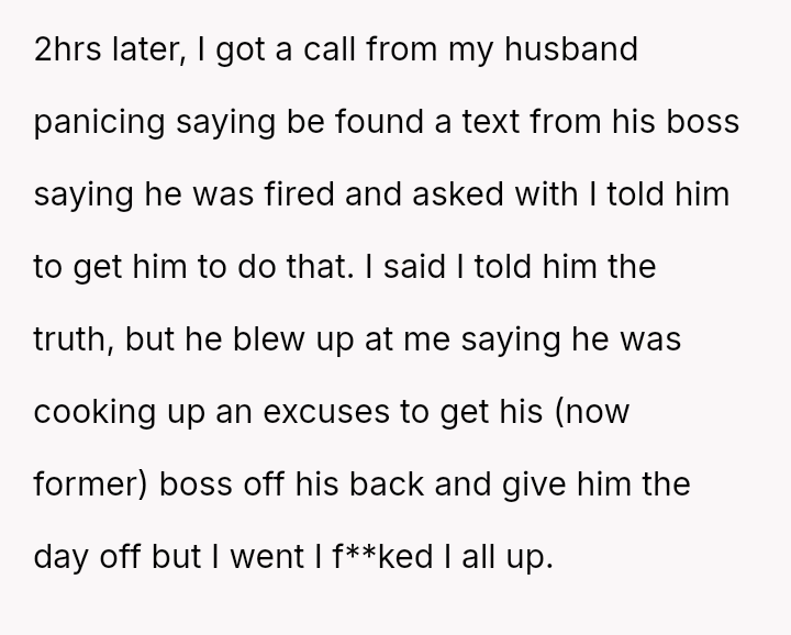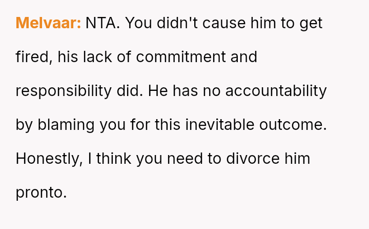 The original poster is clearly experiencing extreme financial stress and frustration due to her husband's repeated job irresponsibility and subsequent job loss.