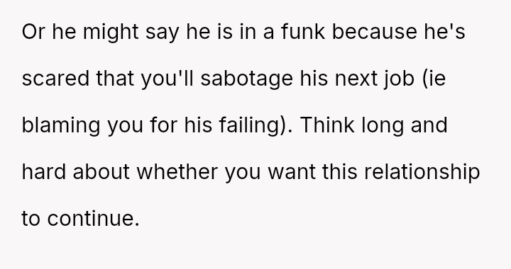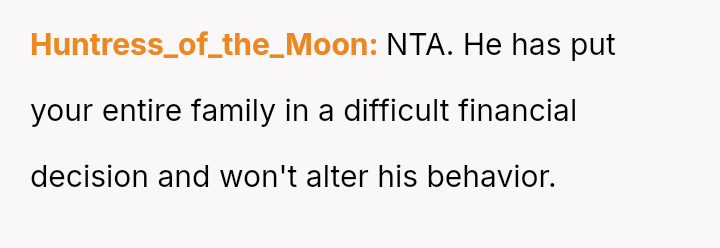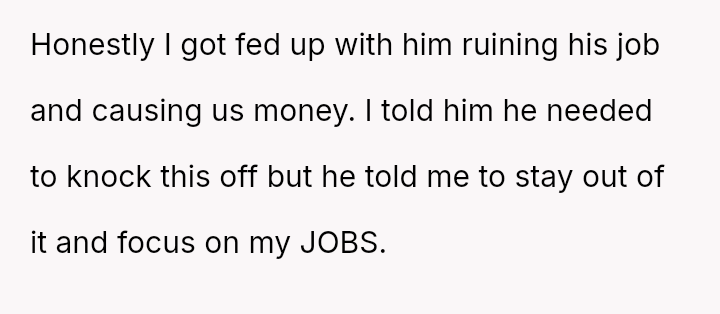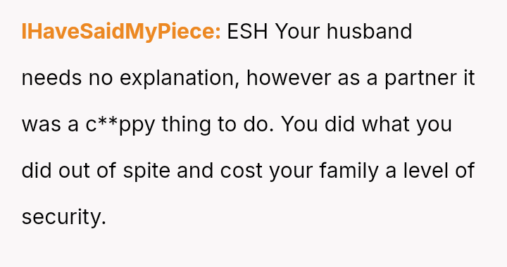 Given the pattern of financial ins**bility caused by the husband's deliberate choices, was the wife justified in prioritizing honesty and the reality of their financial situation over maintaining a protective lie for his benefit, or did her intervention const*tute an inappropriate overreach into his employment affairs?