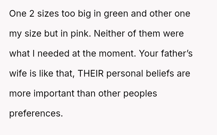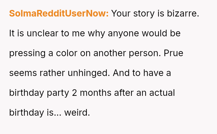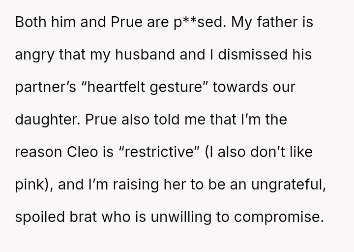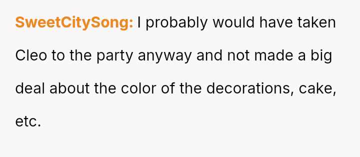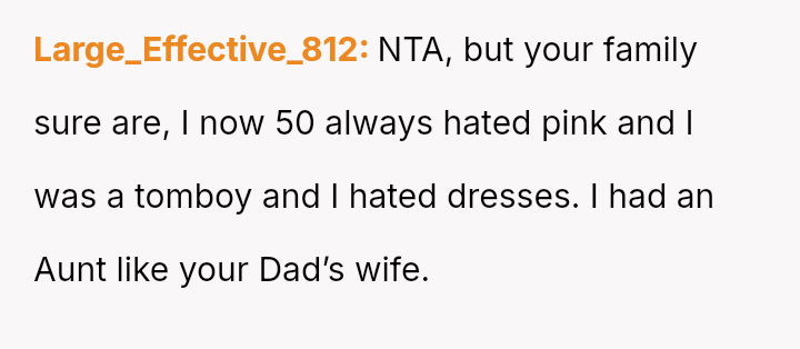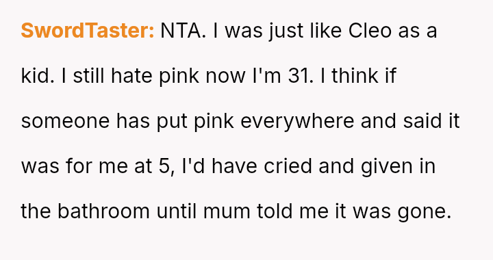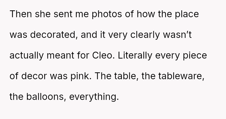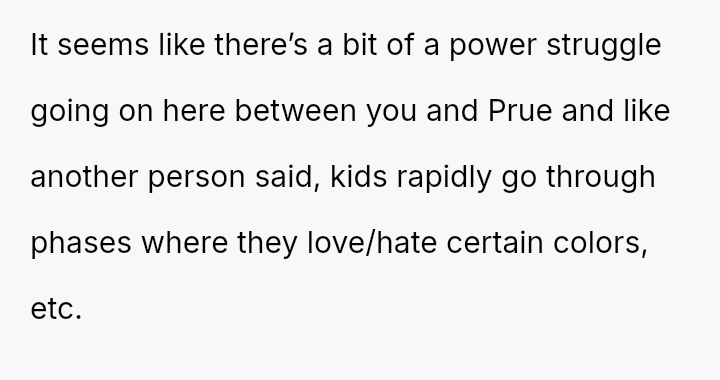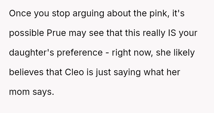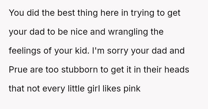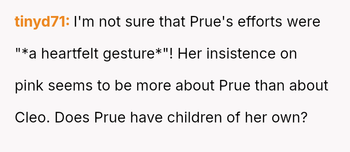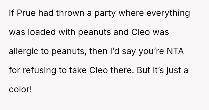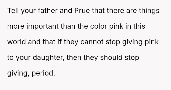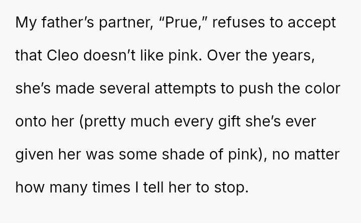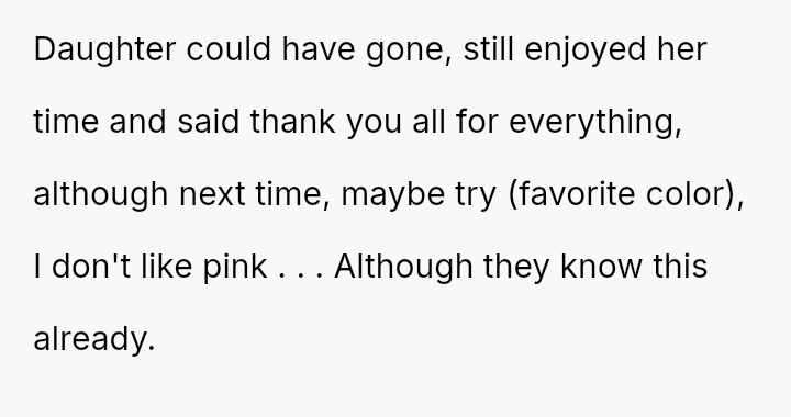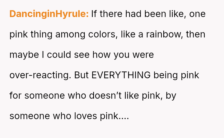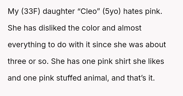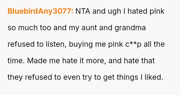 The original poster (OP) faced a situation where a non-parental figure repeatedly ignored their child's clear preference against the color pink, culminating in an elaborate, entirely pink surprise party planned without the OP's consent.