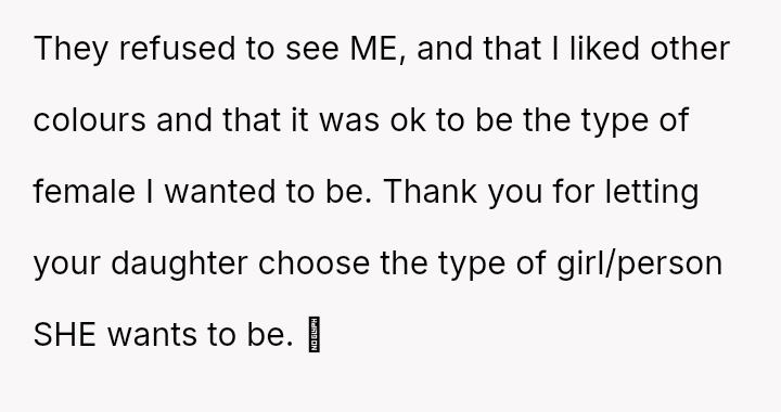 At just five years old, her dislike for pink was not a whim but a clear statement of self, yet the world around her, especially Prue, refused to listen, pressing their colors onto her like a mask she never asked to wear.