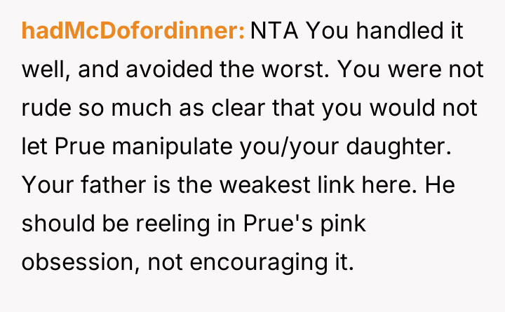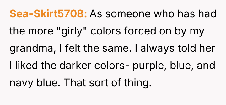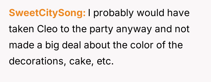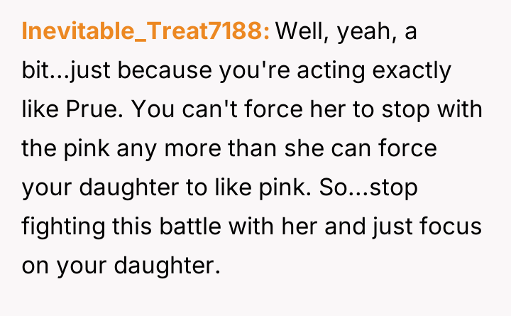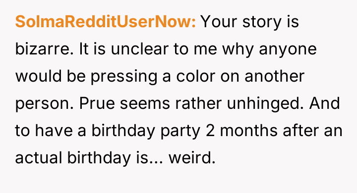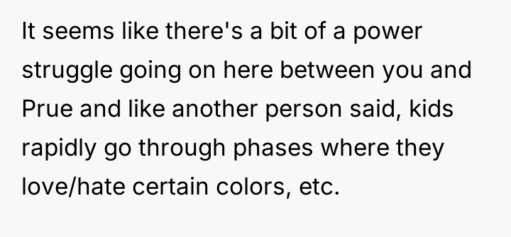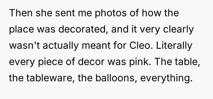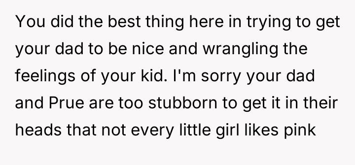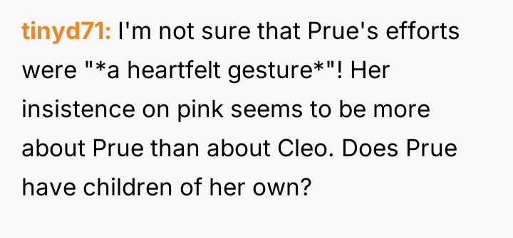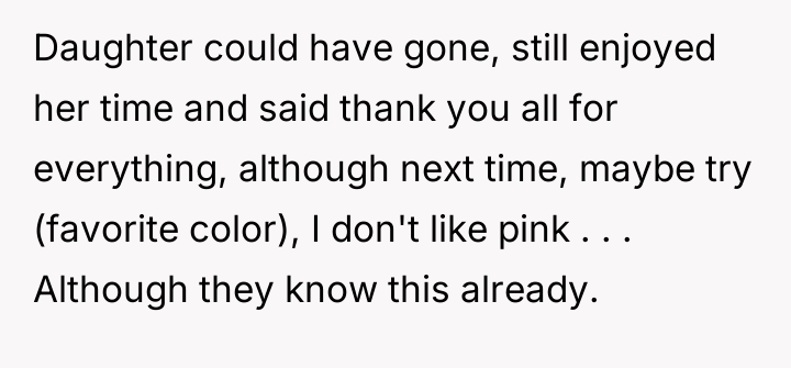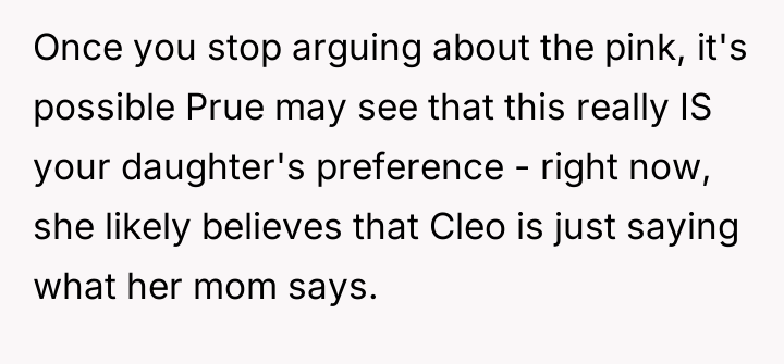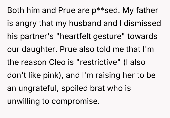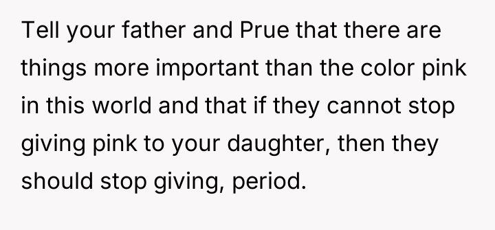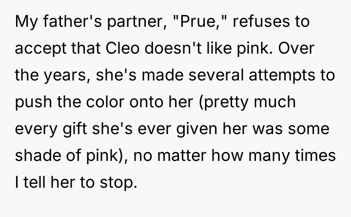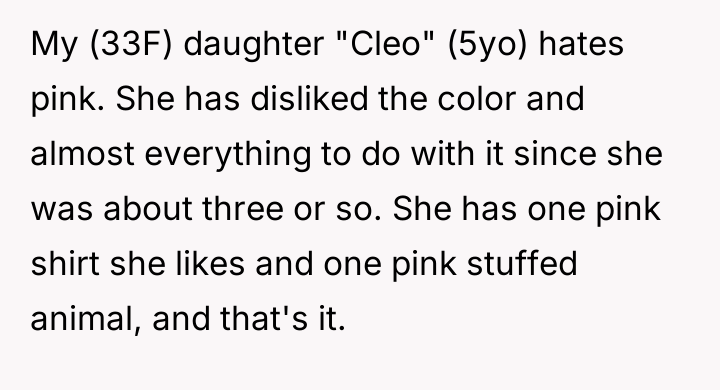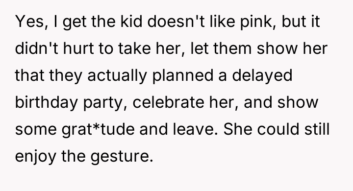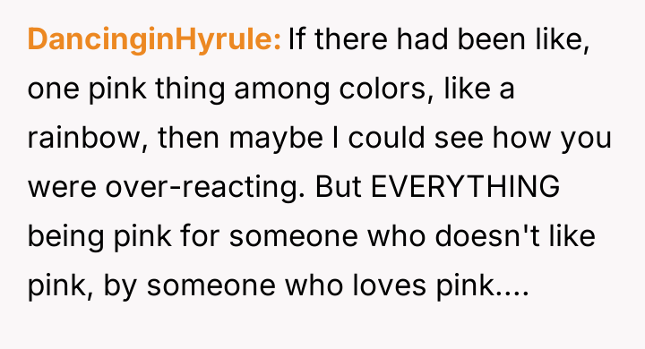 The original poster (OP) faced a situation where a non-parental figure repeatedly ignored their child's clear preference against the color pink, culminating in an elaborate, entirely pink surprise party planned without the OP's consent.
