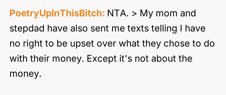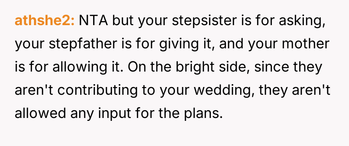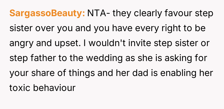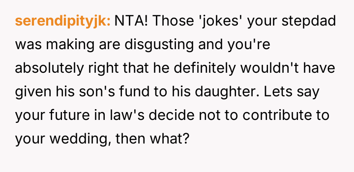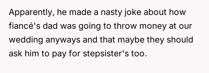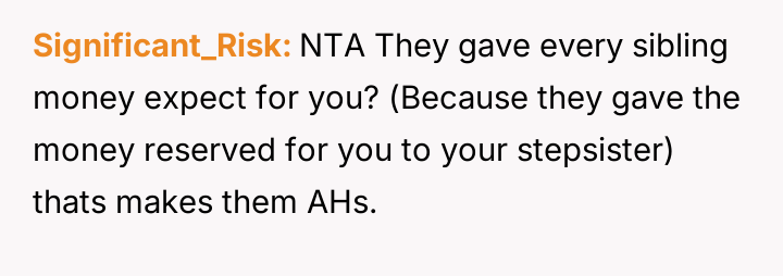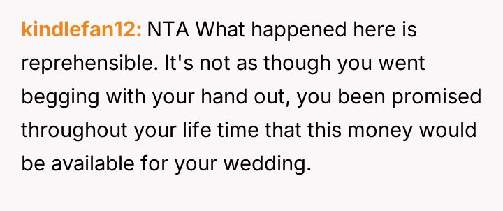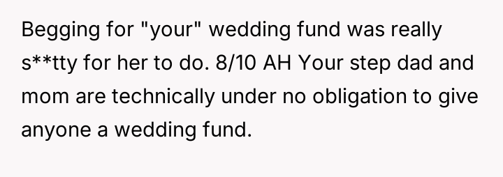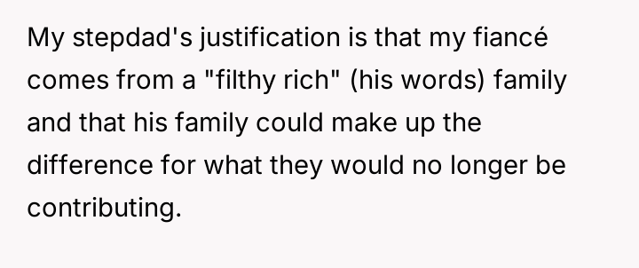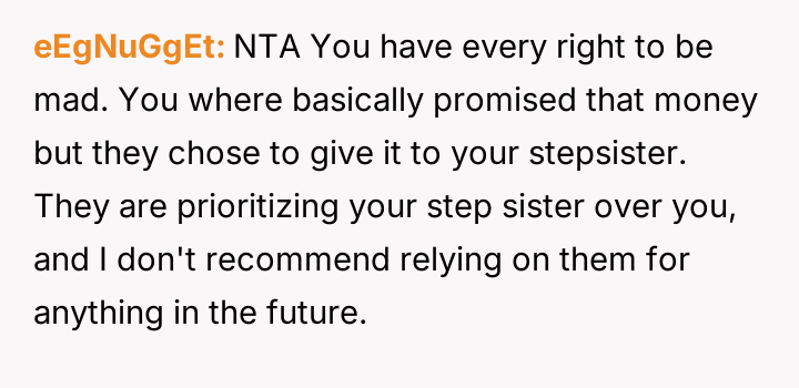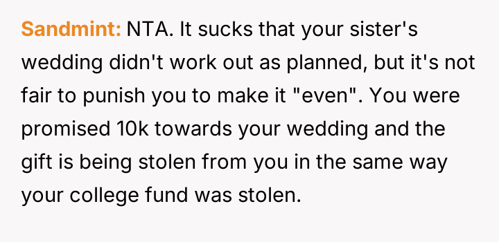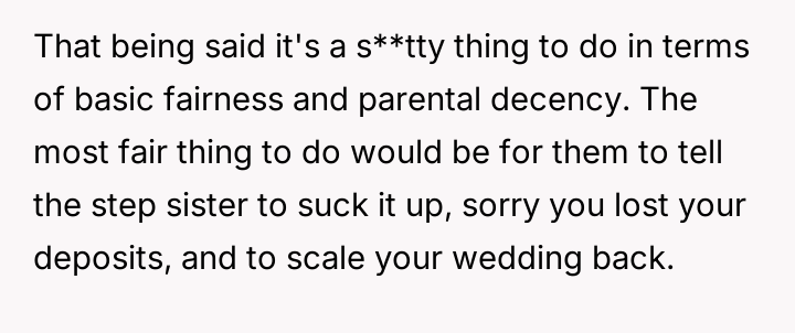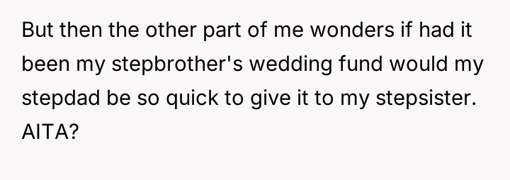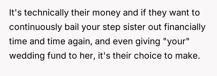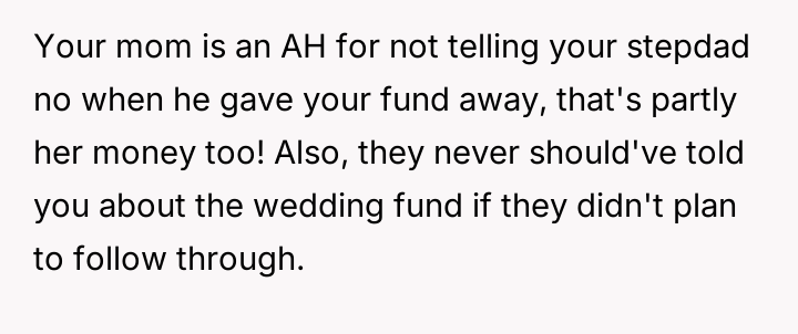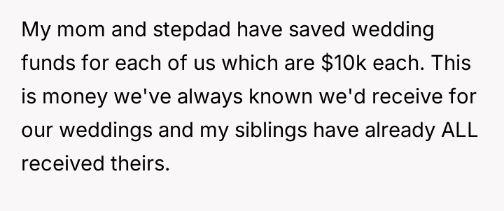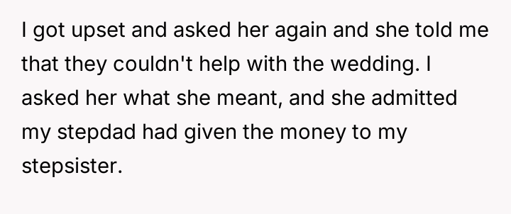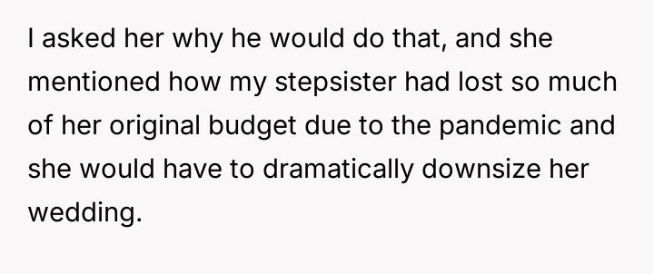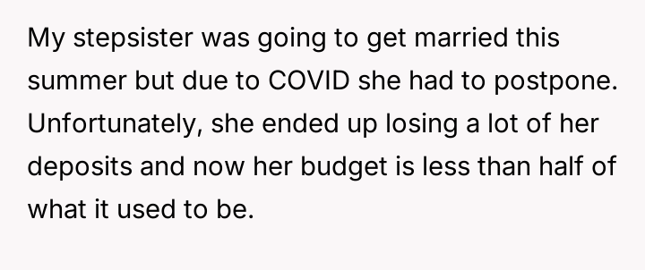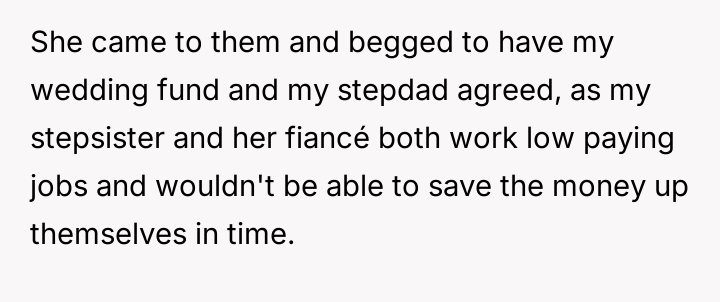 The Original Poster (OP) is facing a significant breach of trust and financial expectation after discovering their promised wedding fund was given to their stepsister to cover pandemic-related losses.