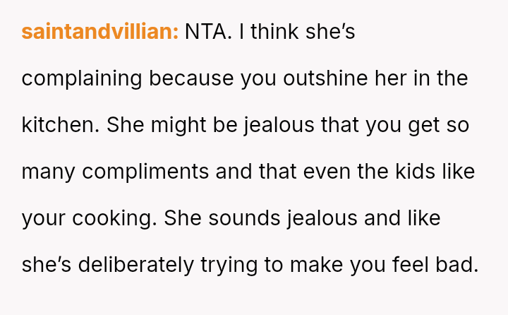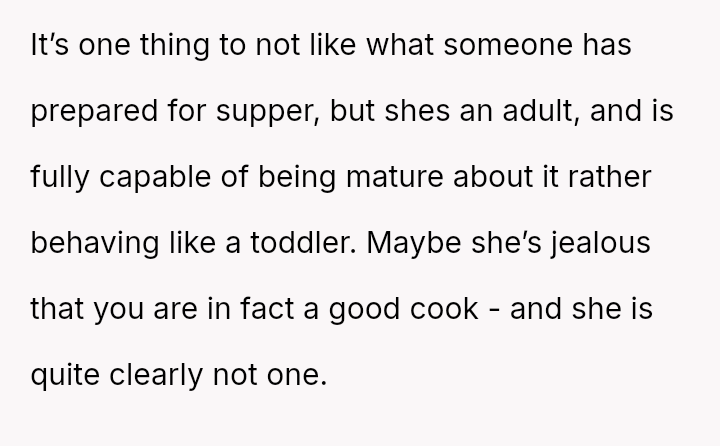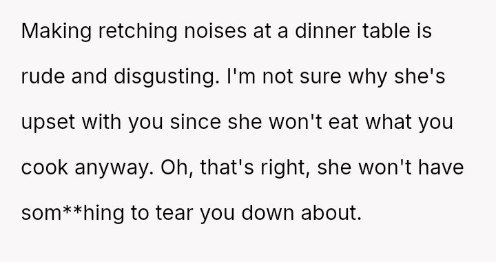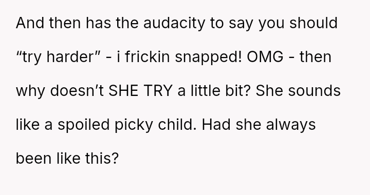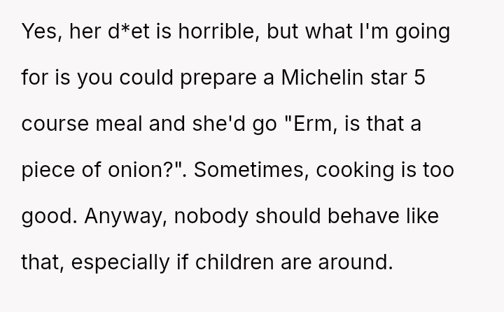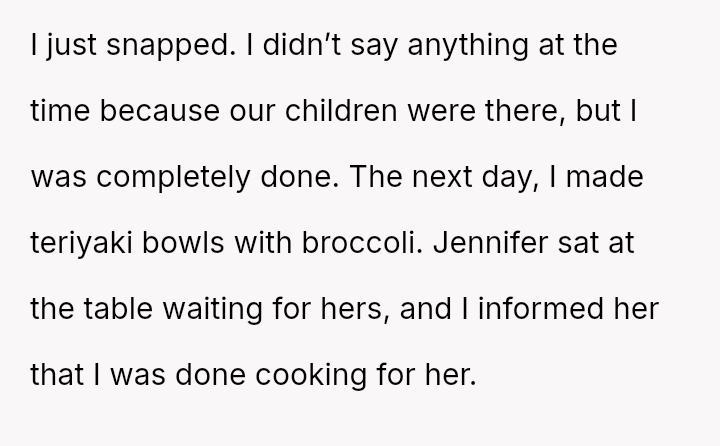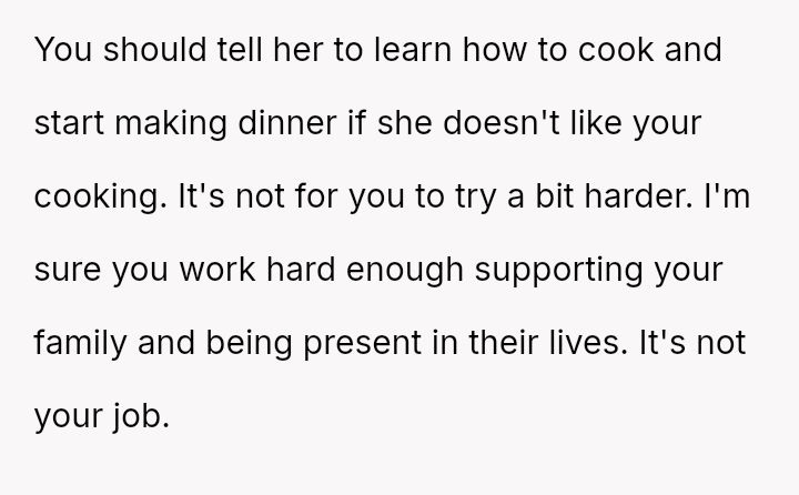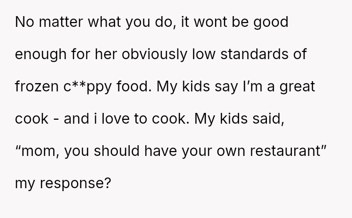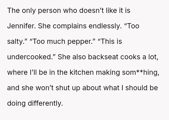 Her relentless complaints and harsh words erode the joy he finds in cooking, turning a shared family ritual into a battleground of unspoken frustrations and unmet expectations.