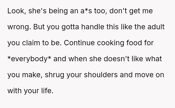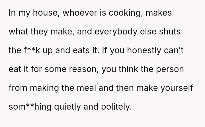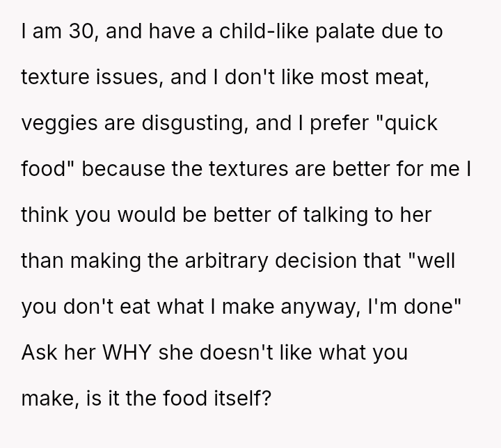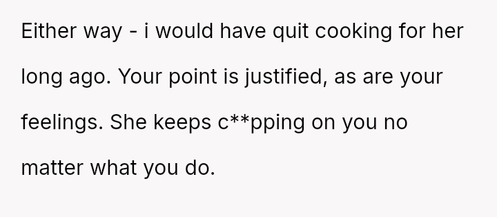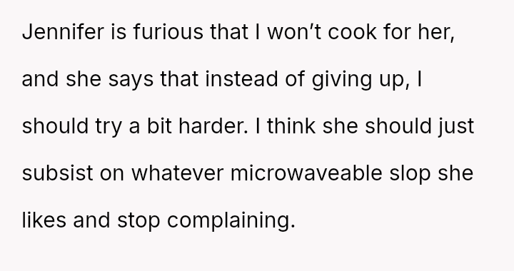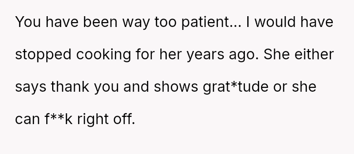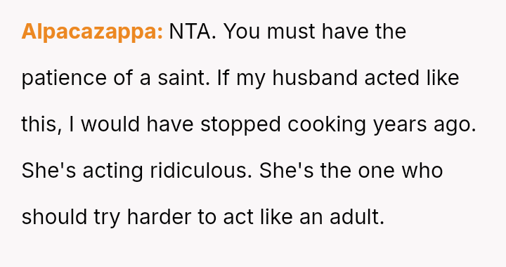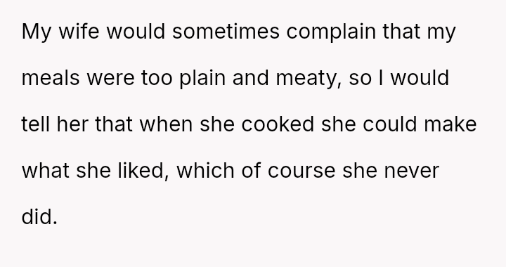 This led him to abruptly cease cooking for her entirely, creating a sharp conflict where his need for respect clashes directly with his wife's expectation that he should continue providing meals despite her negative reactions.