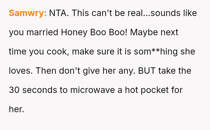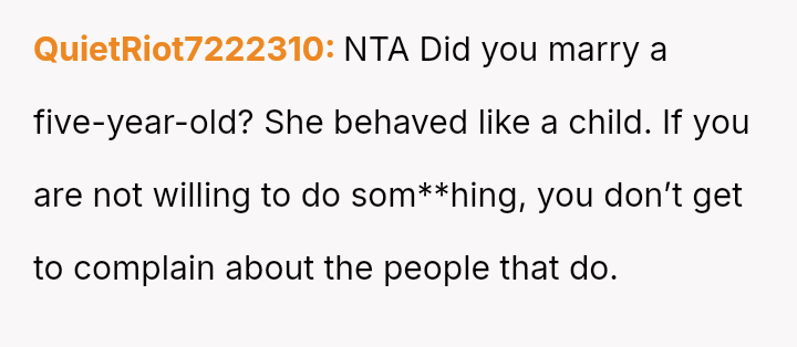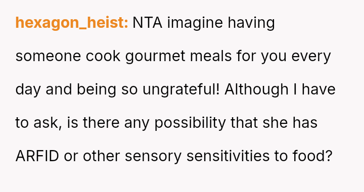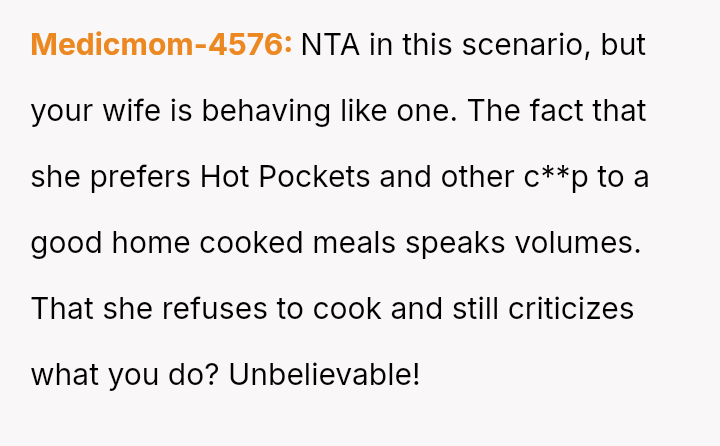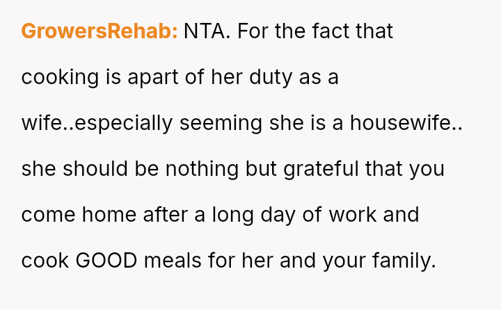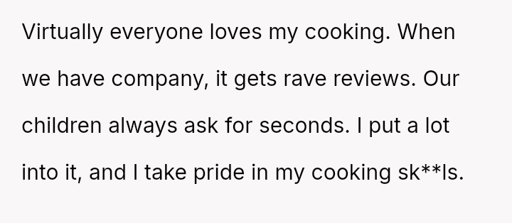 Considering the depth of the wife's consistent dissatisfaction versus the husband's dedication and pride in his sk**l, was the husband's sudden refusal to cook for her an appropriate boundary setting, or was it an unwarranted escalation that damaged their shared domestic responsibilities?