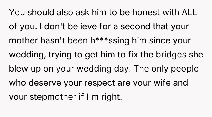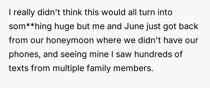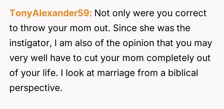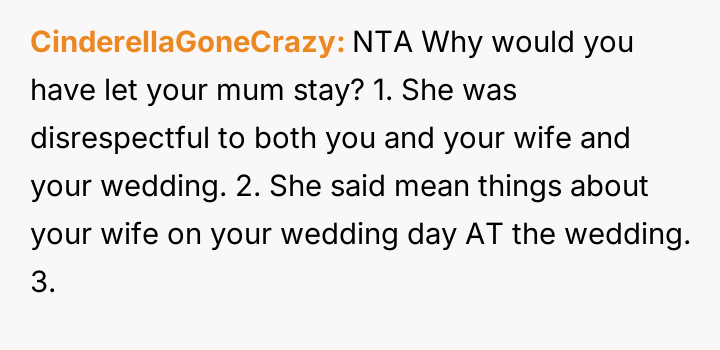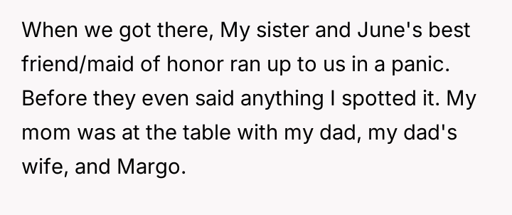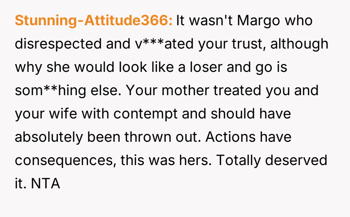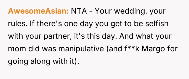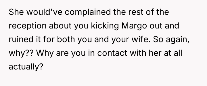 Given the intense emotional fallout, the core question for debate is whether the OP was justified in ejecting his mother from the reception after she deliberately v***ated the safe space created for the wedding, or if a less severe action, such as only removing Margo, would have been a more appropriate way to handle the situation while minimizing family alienation?