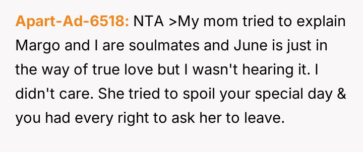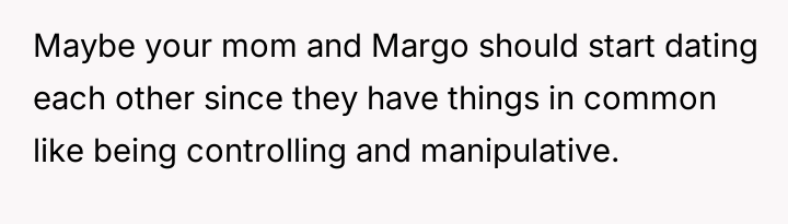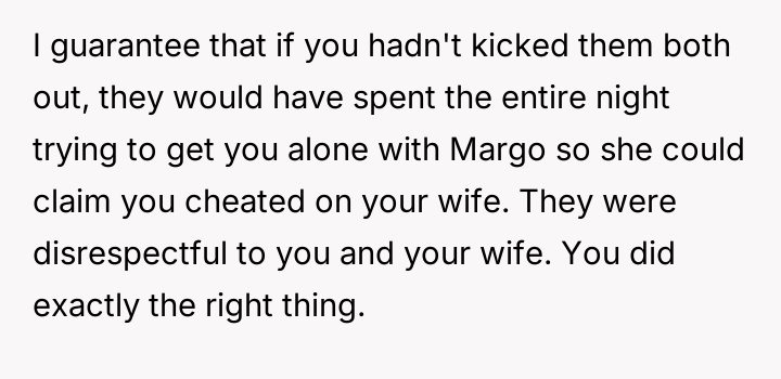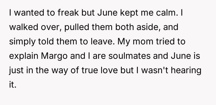 The OP's action to remove both his mother and Margo stemmed from a desire to protect his new marriage and the boundaries es**blished with his fiancée, June.