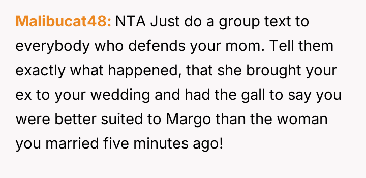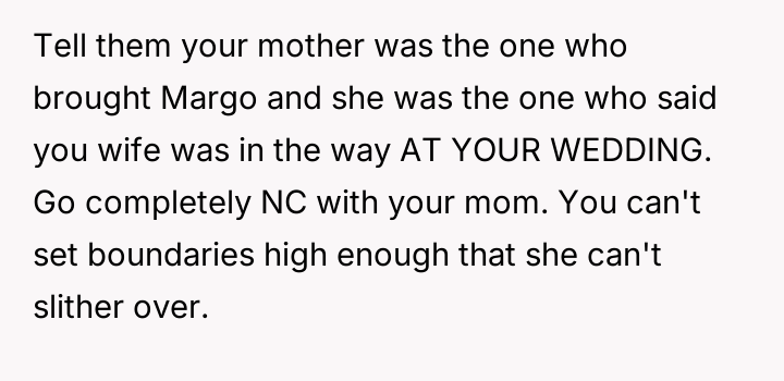The original poster (OP) faced a significant conflict at his wedding when his mother deliberately included his manipulative ex-girlfriend, Margo, in the reception despite the OP's clear boundaries and history with Margo.