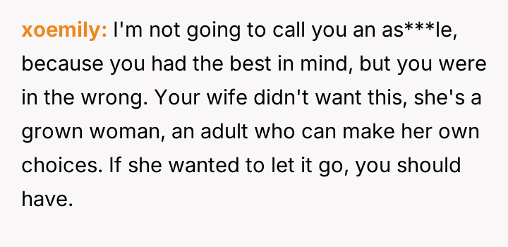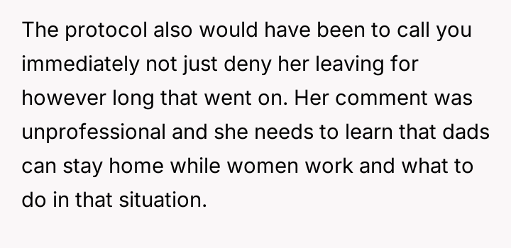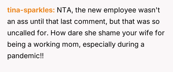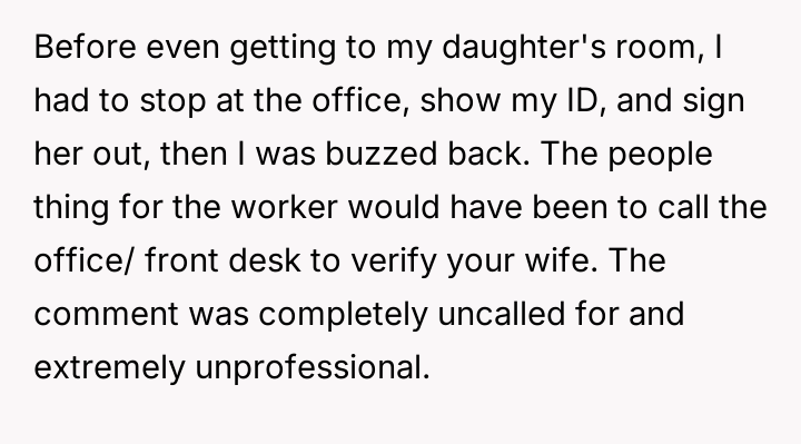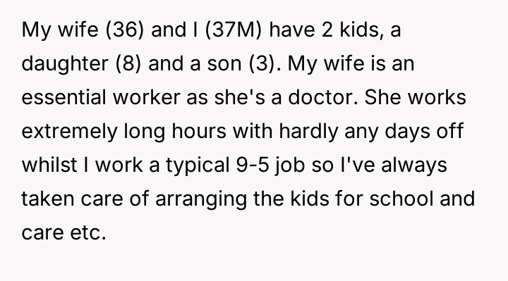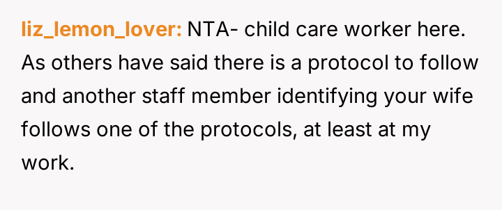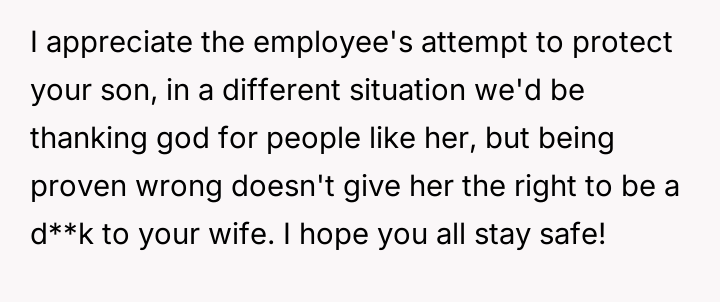 The husband felt compelled to address the unprofessional and hurtful treatment his essential-worker wife received when picking up their son, while the wife prioritized emotional recovery over formal confrontation.