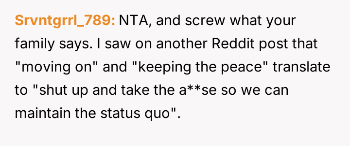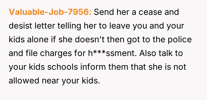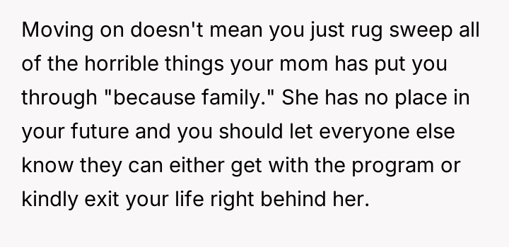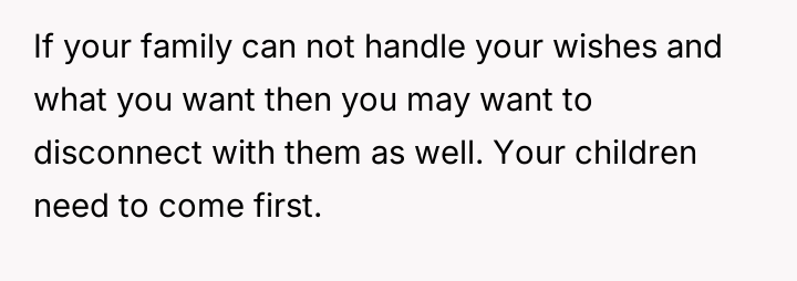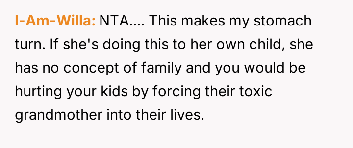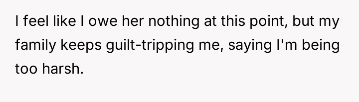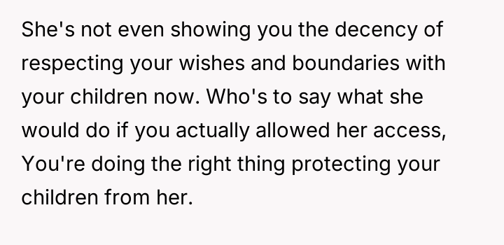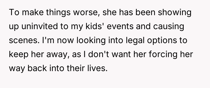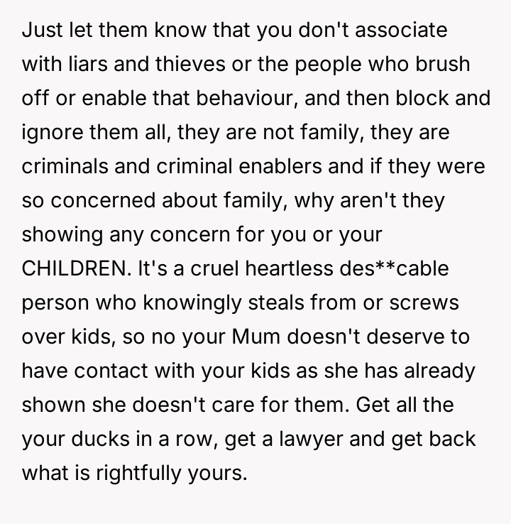 Should the narrator prioritize financial justice and protecting their children from further distress, or should they yield to family pressure to maintain contact with the mother?
