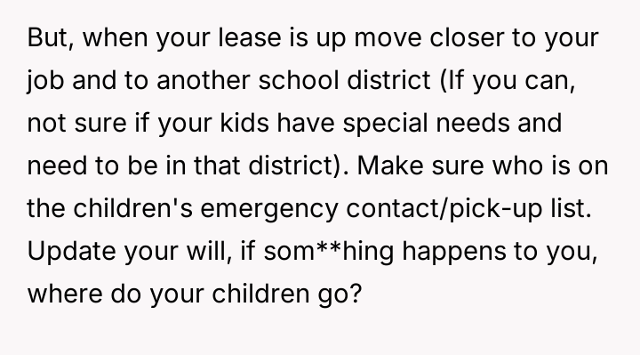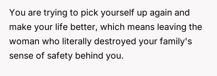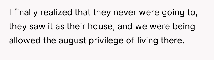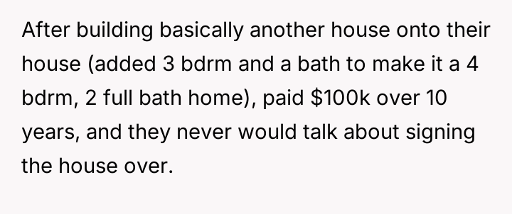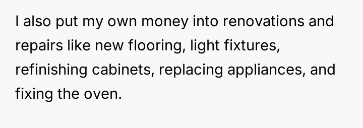 Furthermore, the narrator invested personal funds into significant renovations and repairs, such as new flooring, fixtures, and appliance replacements. The arrangement began in 2015 when the mother bought the house intending to leave her husband.