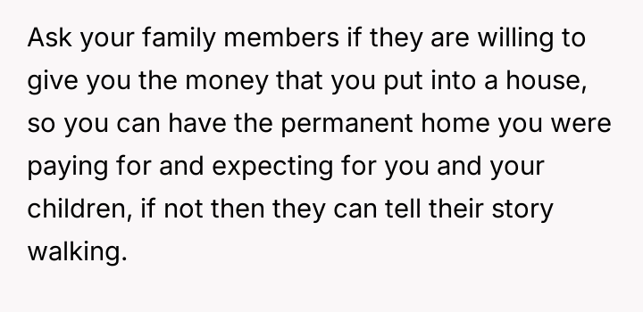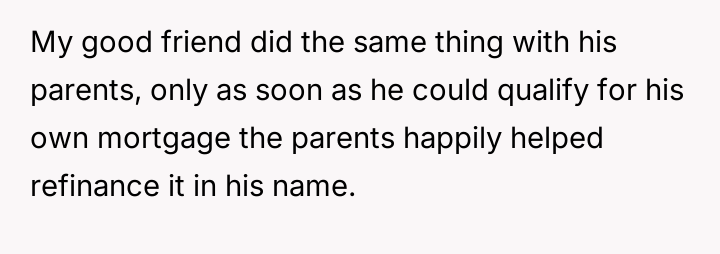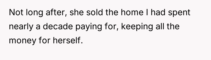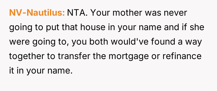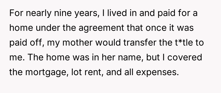 For almost nine years, the narrator lived in and paid for a home under the agreement that their mother would transfer the t*tle over once the mortgage was paid off.