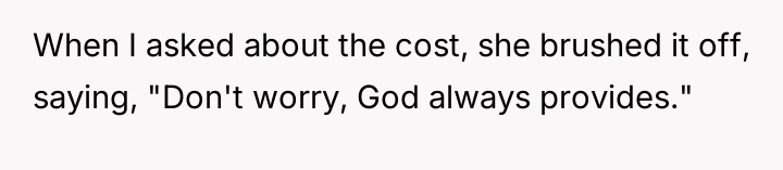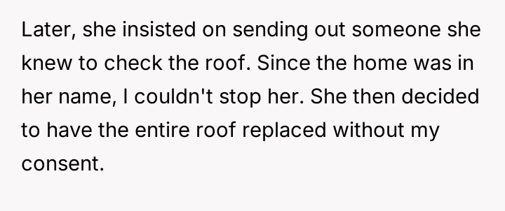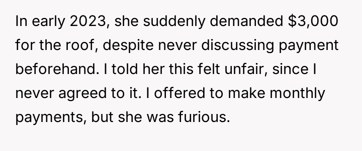 The relationship soured significantly in 2022 when the mother unilaterally decided to replace the roof without consulting the narrator, later demanding payment.