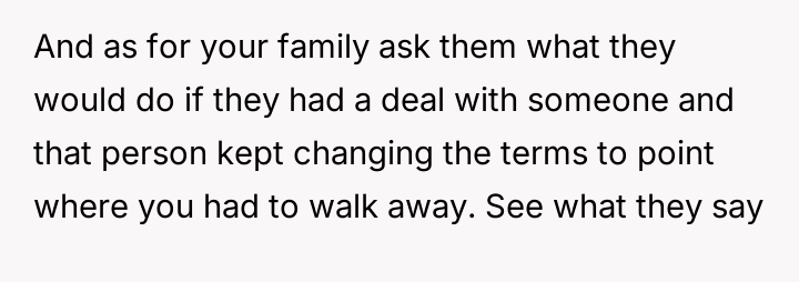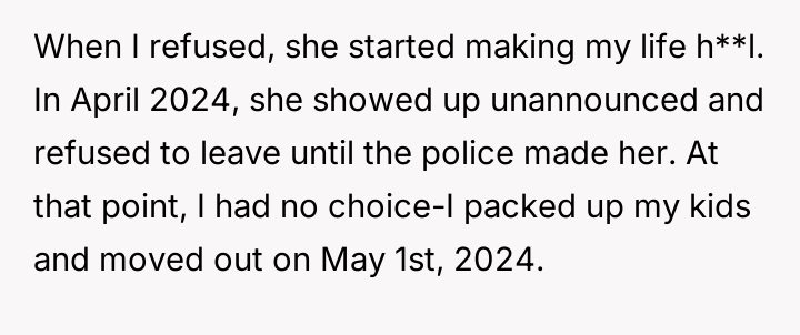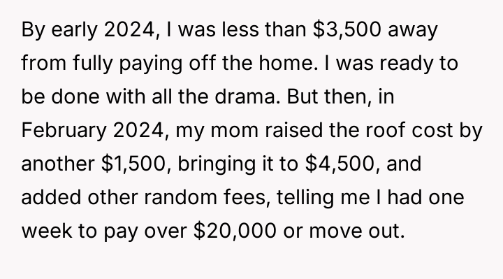 After the narrator refused an unexpected, inflated payment demand, the mother issued an ultimatum: pay over $20,000 in one week or move out.