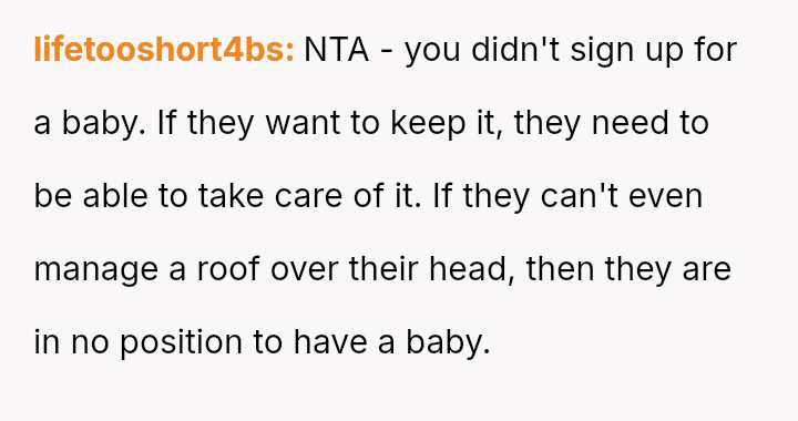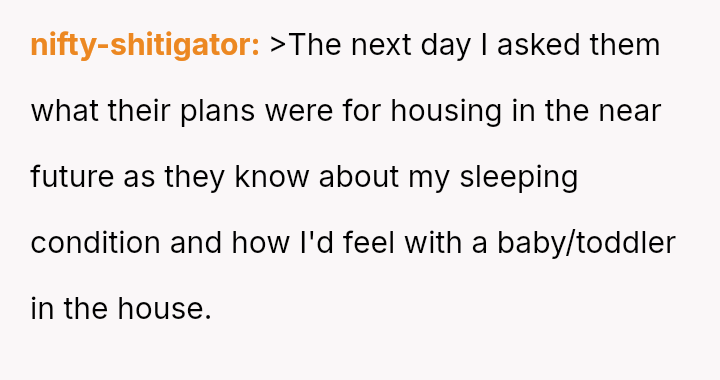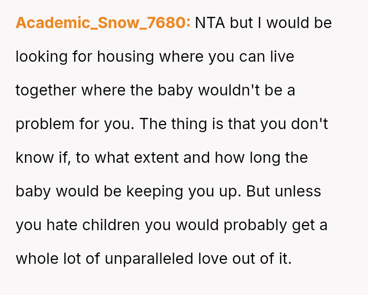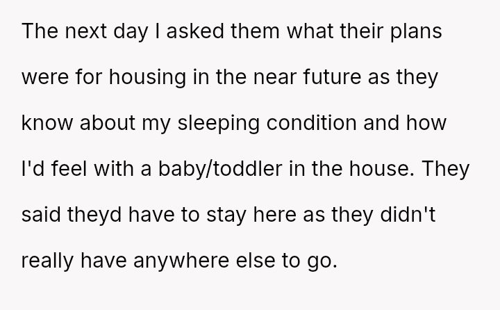 By agreeing to house them, the OP prioritized family support, but the unexpected pregnancy introduces a new, non-negotiable element—a crying infant—that directly threatens the OP's es**blished sanctuary and mental health.