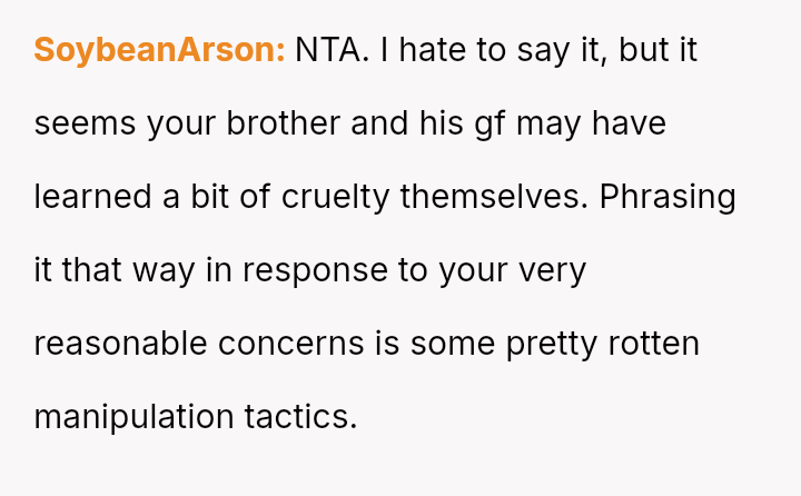 The original poster (OP) is facing a difficult conflict between their deep need for personal safety and peace, es**blished after escaping a toxic home environment, and their supportive relationship with their brother and his partner.