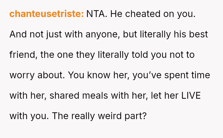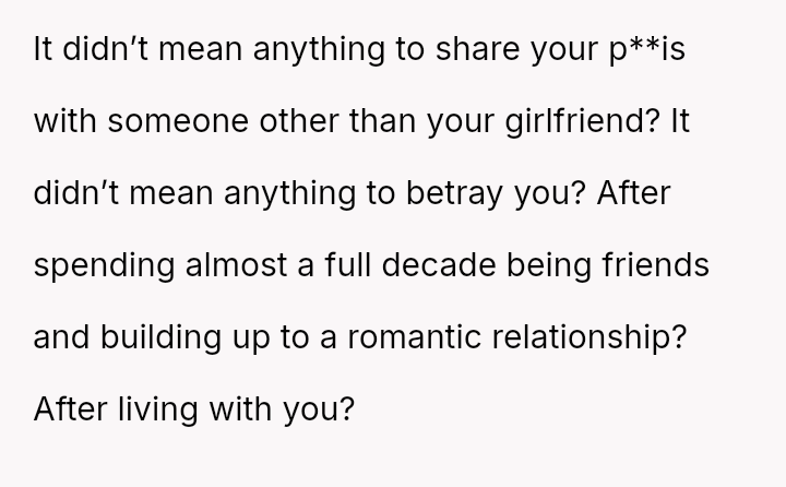 The original poster (OP) is dealing with profound feelings of betrayal, shock, and anger after discovering her long-term partner cheated with a close housemate.