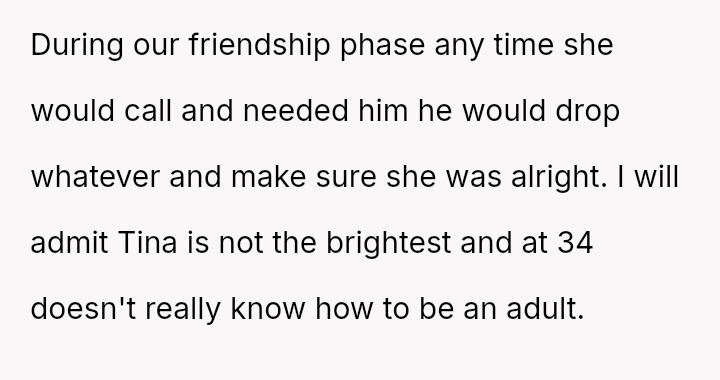 The central conflict is between her justified need to protect herself emotionally and financially, and the expectation from some that she should offer him a courtesy warning about the immediate logistical consequences of her departure, given his financial dependence.