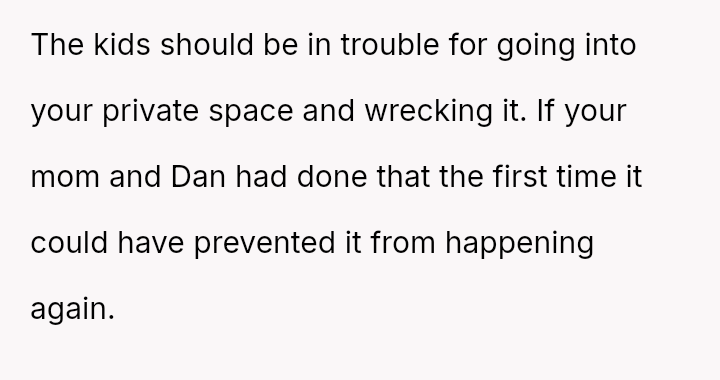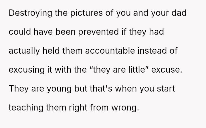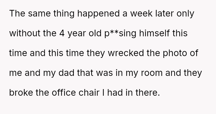 A week later, the children again damaged the OP's room, this time breaking a chair and wrecking a cherished photo of the OP and their deceased father.